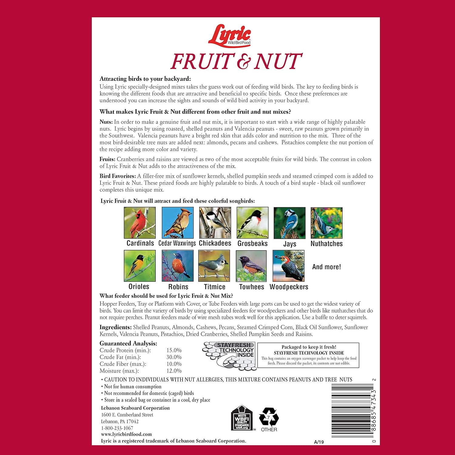Lyric Fruit and Nut Wild Bird Seed - High Energy Wild Bird Food Mix - Attracts Woodpeckers, Chickadees & Other Songbirds - 20 lb bag