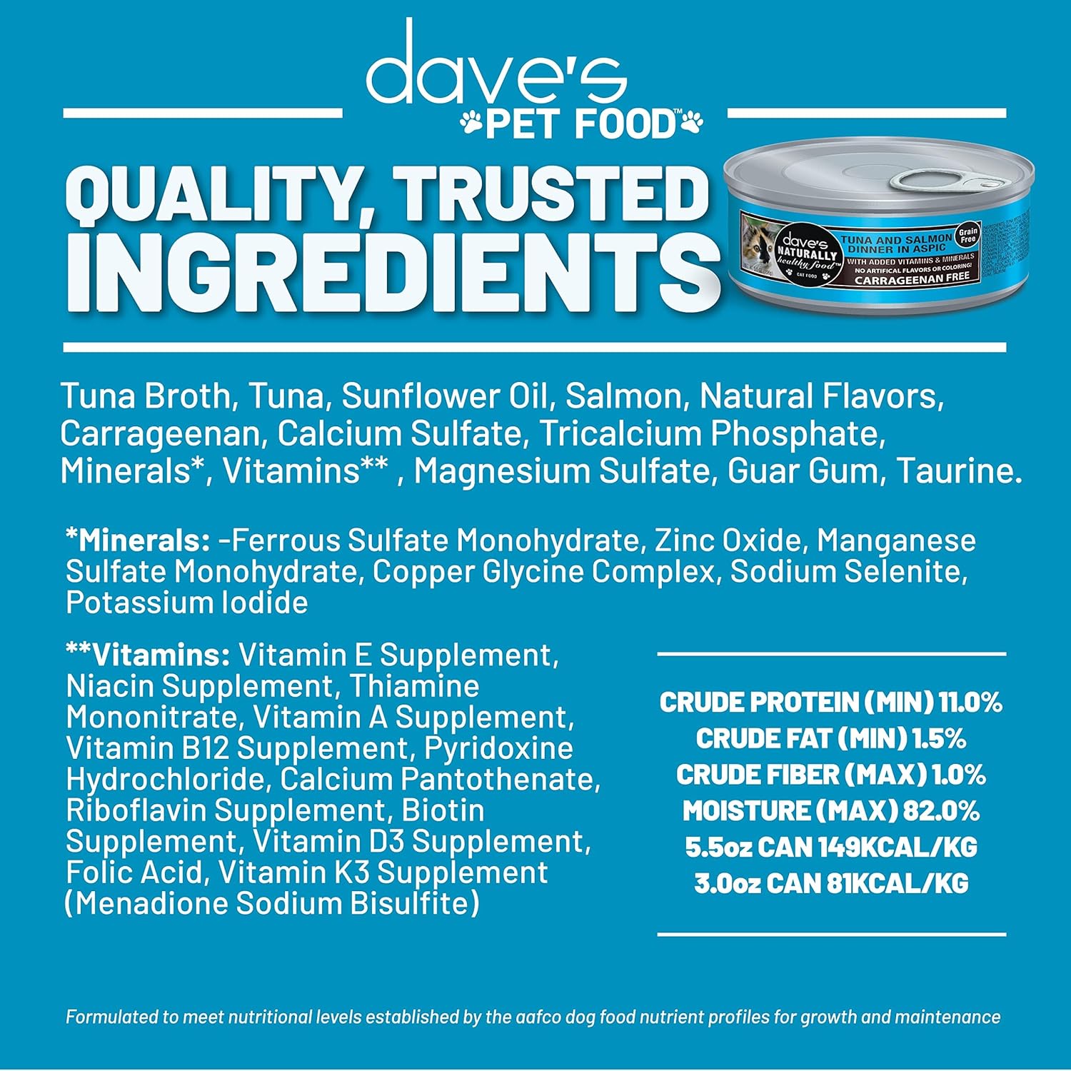 Dave's Pet Food Grain Free Wet Cat Food (Tuna & Salmon in Aspic), Naturally Healthy Canned, Added Vitamins & Minerals, Wheat & Gluten-Free, 3 oz (24 Pack)