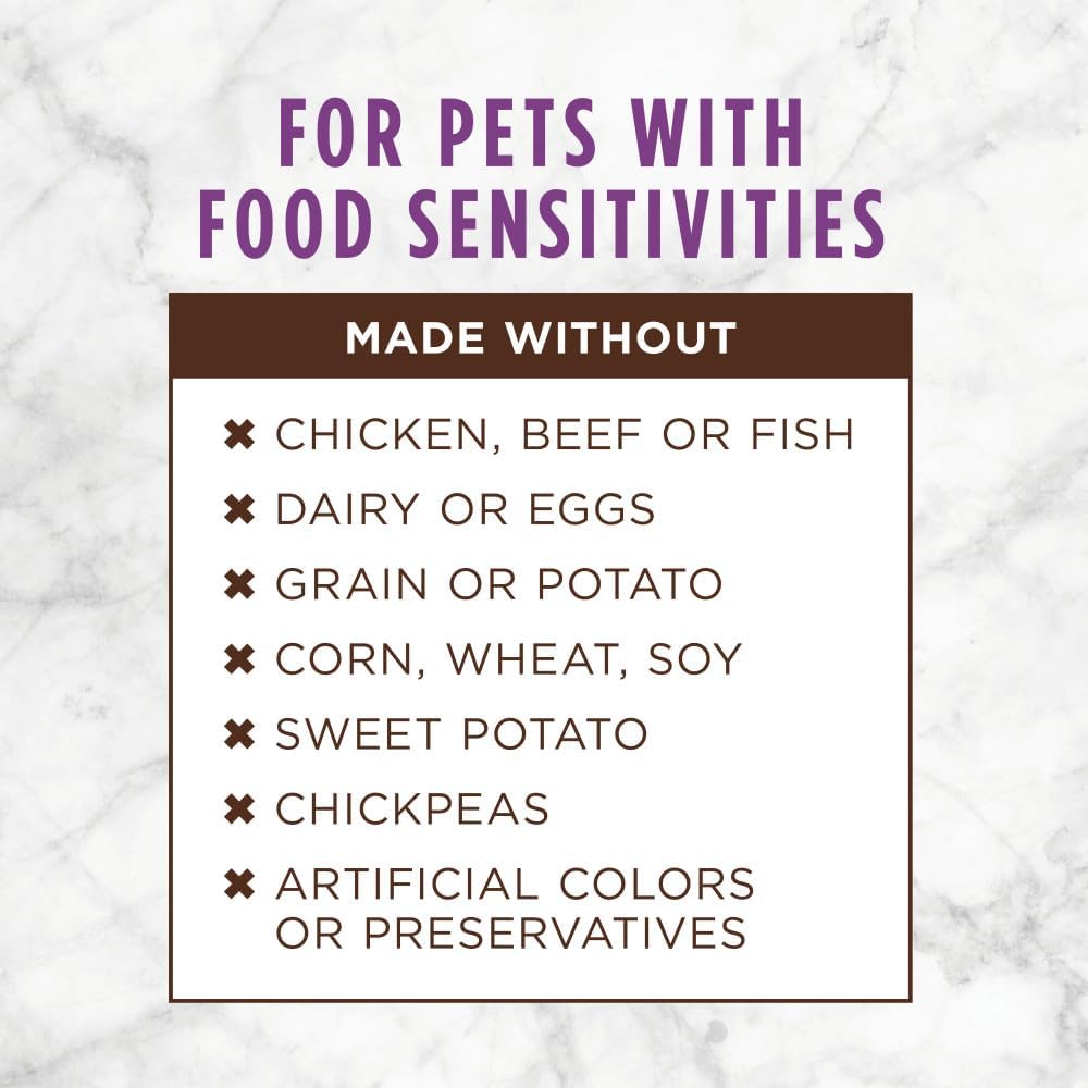 - GRAIN FREE CAT FOOD FOR CATS WITH SENSITIVITIES: Instinct Limited Ingredient cat food is made with 1 protein & 1 vegetable. No grain, dairy, eggs, chicken, beef, fish, sweet potato, potato, chickpeas, corn, wheat, soy, artificial colors or preservatives.