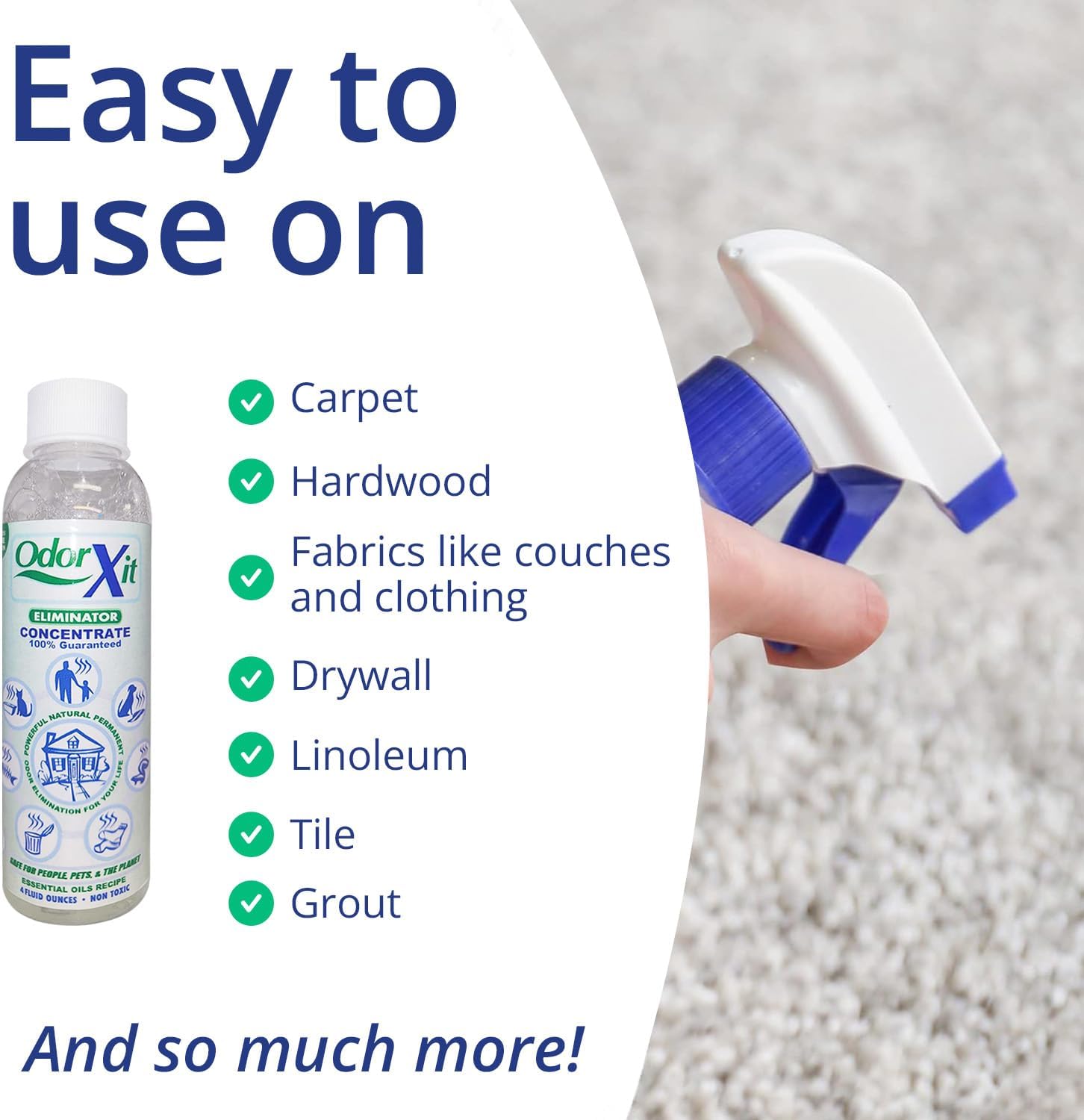 - Eliminate Tough Odors: OdorXit Odor Eliminator works to effectively remove strong odors at the source; Effectively removes odors of pet or human pee and poo, vomit, skunk spray, decay, spoiled food, fish, and more; Great for those with incontinence