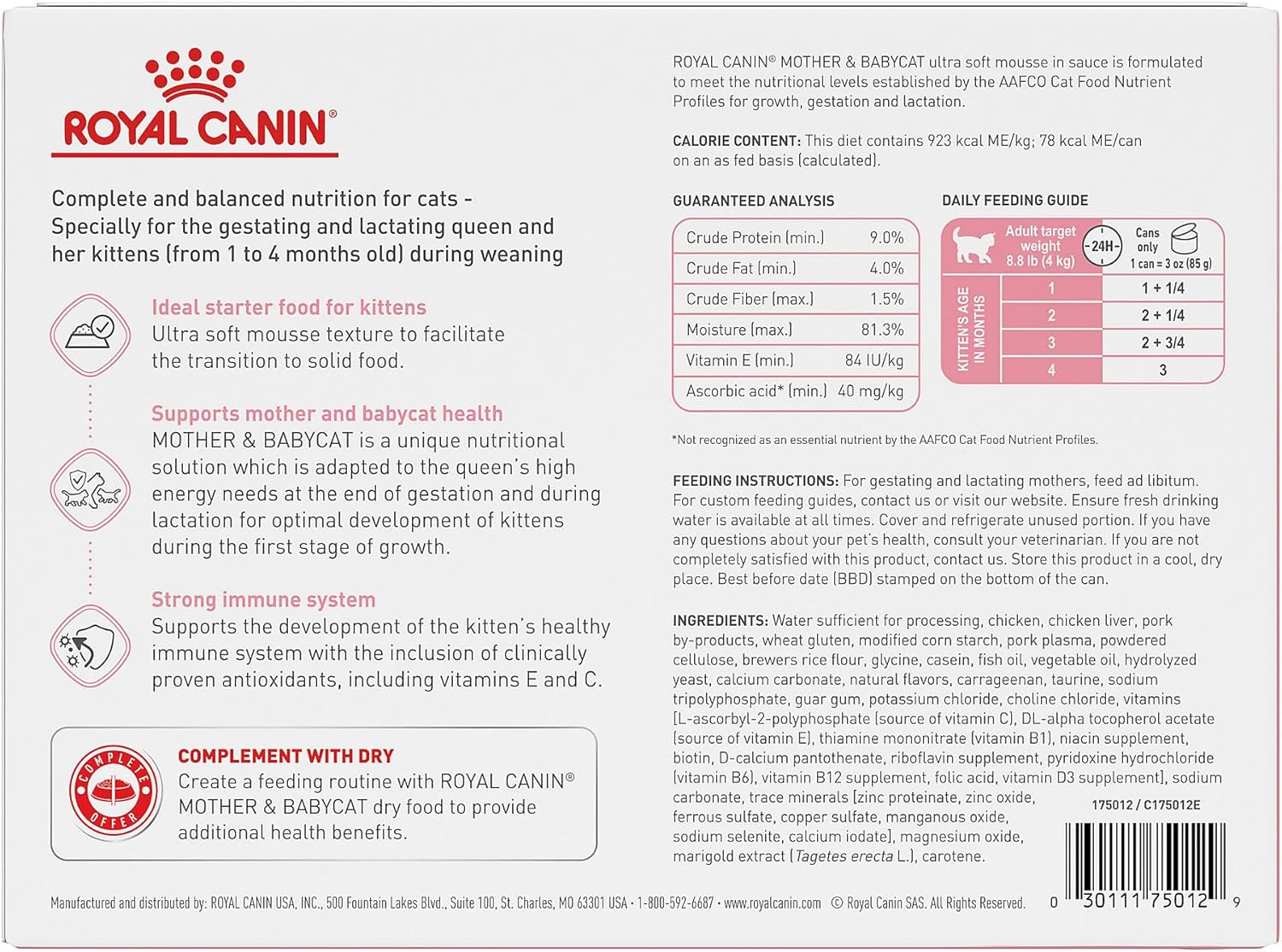 - SUPPORTS MOTHER & BABYCAT HEALTH: Royal Canin Mother & Babycat Ultra Soft Mousse in Sauce Canned Cat Food is a unique nutritional solution that supports mother cats (pregnant or nursing), and the healthy growth and development of newborn kittens (1-4 months)