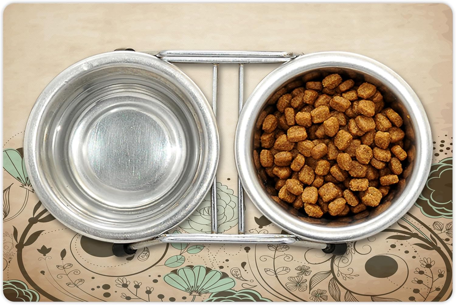 Lunarable Abstract Pet Mat for Food and Water, Old Dated Vintage Retro Antique Image with Floral Swirls Art Print, Non-Slip Rubber Mat for Dogs and Cats, 18" X 12", Brown Turquoise