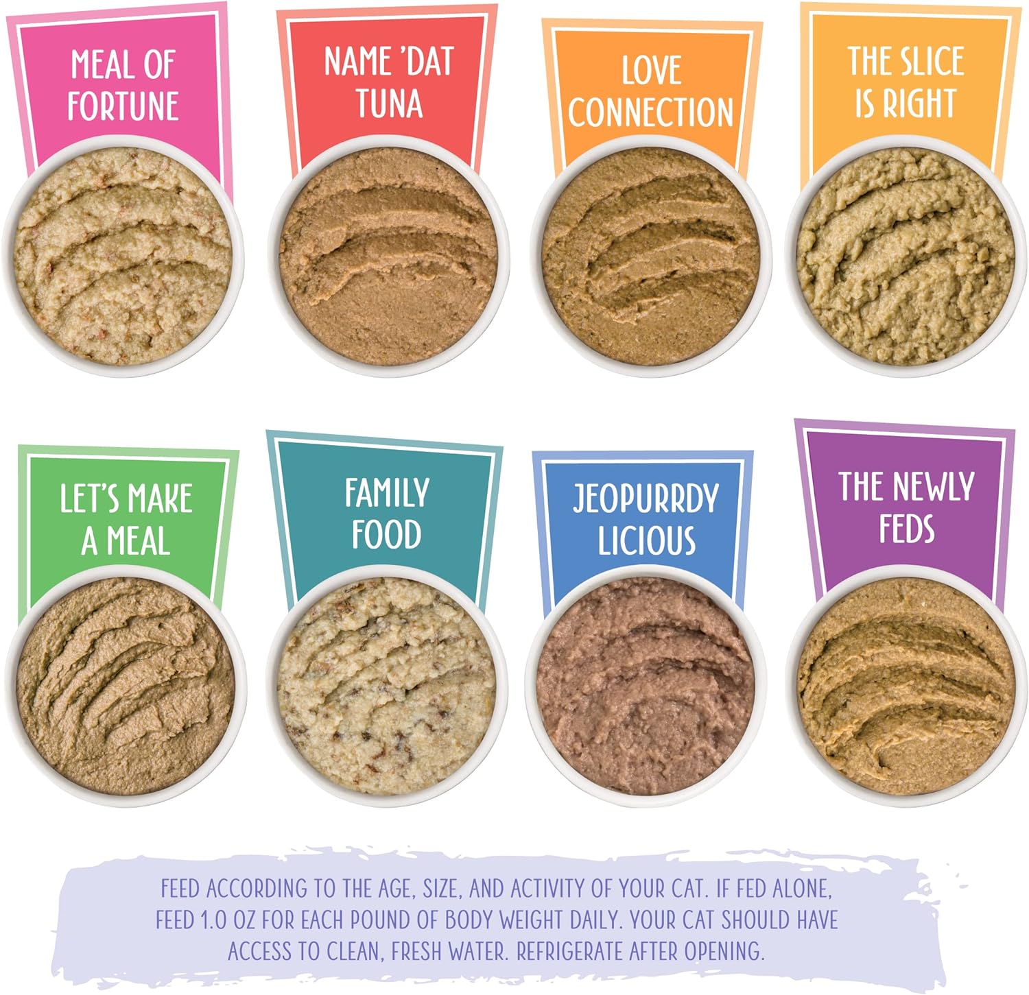 - Variety Pack includes 2 pouches of each: The Newly Feds, Jeopurrdy Licious, Love Connection, Let’s Make a Meal, Meal of Fortune, Name 'Dat Tuna, The Slice is Right, Family Food