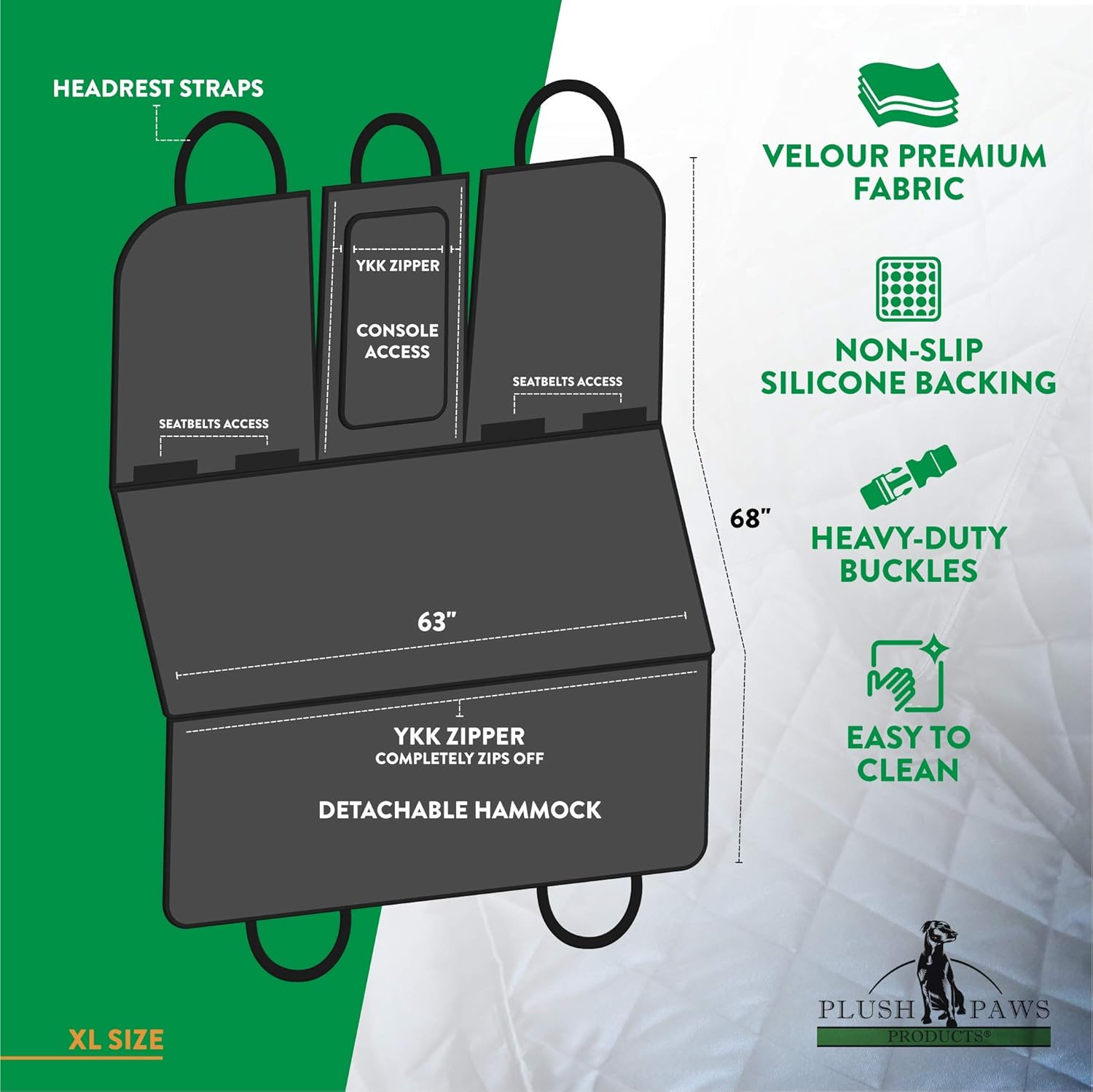 - πππ¦π¬ π§π’ ππ‘π¦π§πππ: Our sizes options are REGULAR - 56''W X 65''L, EXTRA LARGE - 63''W X 68''L, and all have 9'' X 18'' SIDE FLAPS. This elastic skirt and adjustable back and headrest straps provide a seamless clean look and snug fit. Buckle the dog car seat protector to your back seat using the adjustable back strap and insert the seat anchors to secure the cover in place. The headrest strap fits most vehicles.