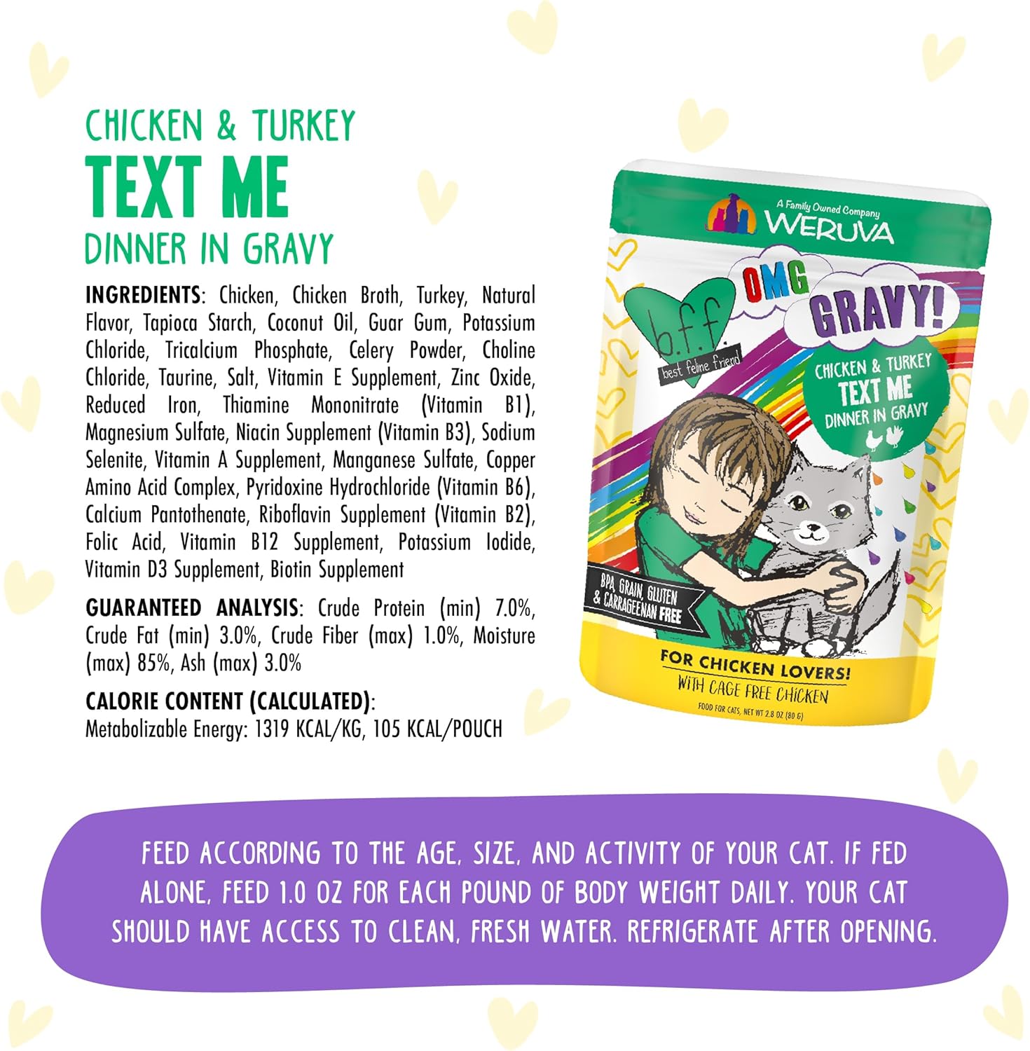 Weruva B.F.F. OMG - Best Feline Friend Oh My Gravy!, Chicken & Turkey Text Me with Chicken & Turkey in Gravy, 2.8oz Pouch (Pack of 12)