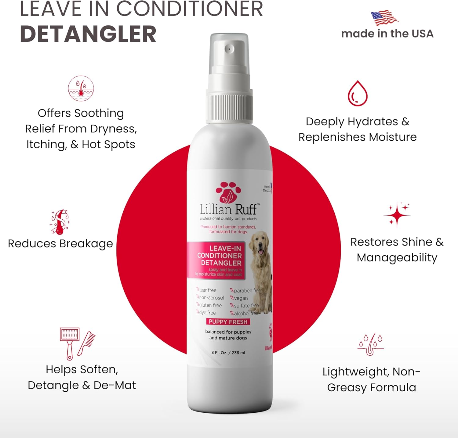 - Effortless Grooming: Make grooming a breeze with Lillian Ruff Leave-In Conditioner/Detangler. Its easy-to-use formula effectively untangles knots, prevents matting, and enhances coat brilliance, ensuring a smooth and shiny appearance for your furry friend.