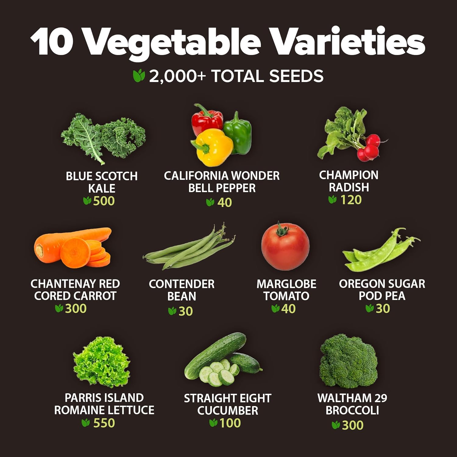 HOME GROWN π¨π¦π π£π₯ππ ππ¨π 10 Variety Vegetable 2,000+ π‘π’π‘-ππ π’ Seeds (Kale Lettuce Tomato Broccoli Beans Peas Bell Peppers Carrot Cucumber Radish) β Indoor & Outdoor Garden Survival Seeds