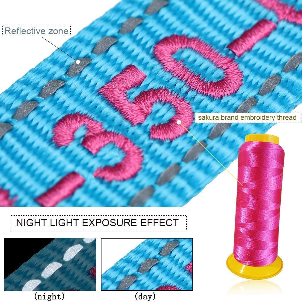 - 5 collar colors-Blue, Green, Teal, Black, Pink and 10 embroidery thread color options-Orange,White, Black, Navy blue, Pink, blue, Purple, red, Teal,Yellow,Green. For threads it is best to use a contrasting color to the nylon. If you choose a dark Collar Color then go with a light colored thread. If you choose a light collar color then go with a dark thread.