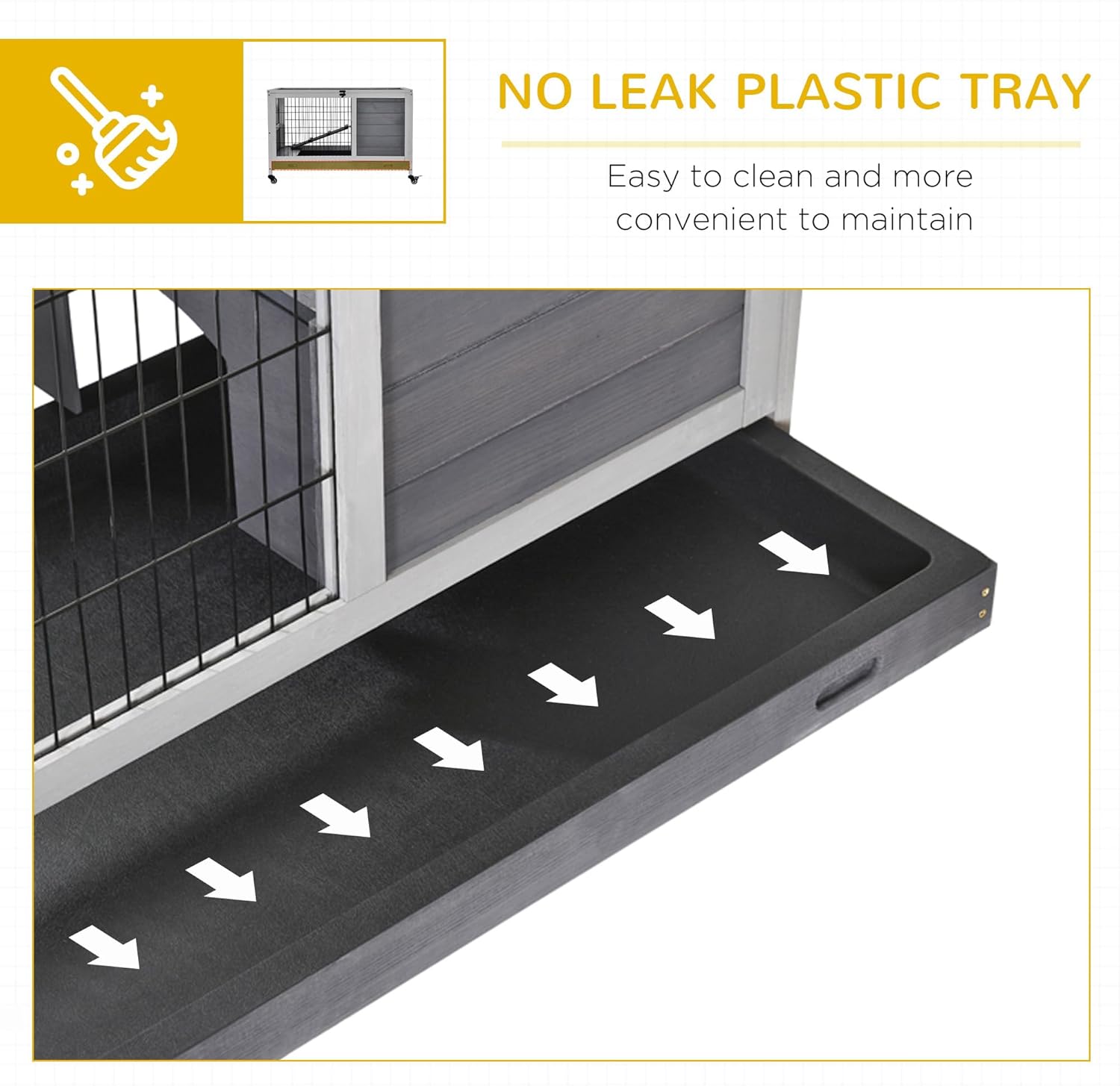 - Easy to Clean: The bunny hutch is easily accessible for cleaning, featuring a wide front door, a bottom slide-out tray and an easily-opened roof.