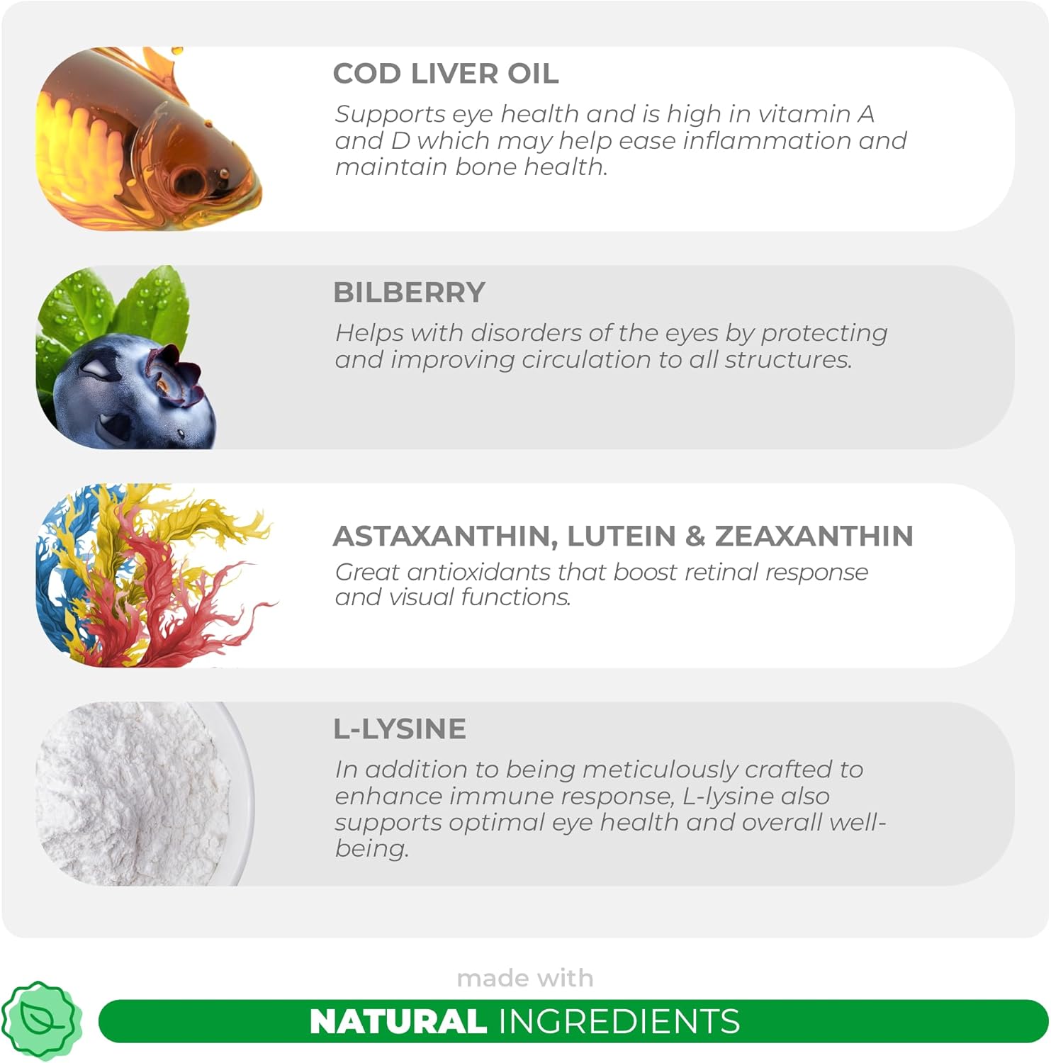 - Eye Function Dog Vitamins - Our formula has ingredients like Cod Liver Oil, Bilberry Fruit, Astaxanthin, Vitamins C and E to help support overall eye function.