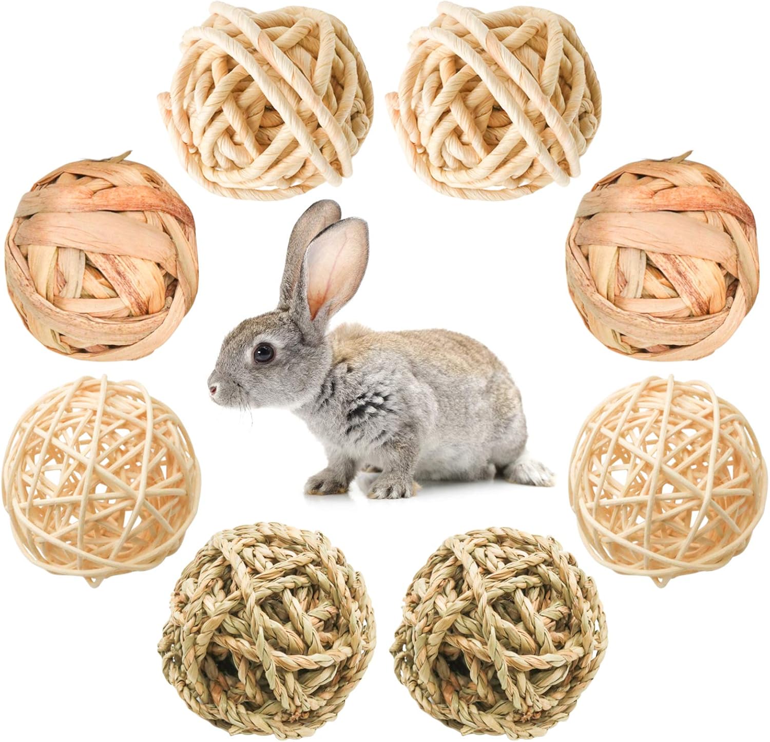 8 Pcs Small Animals Play Balls Rolling Activity Chew Toys Gnawing Treats for Rabbits Guinea Pigs Chinchilla Bunny Natural Balls, Pet Cage Entertainment Accessories (8Pcs)
