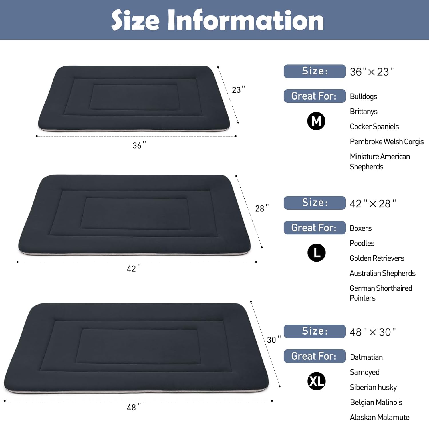 - Pet Beds Size Information: 36 (36 x 23 inch) , 42 (42 x 28 inch) , 48 (48 x 30 inch), perfectly for all size dogs