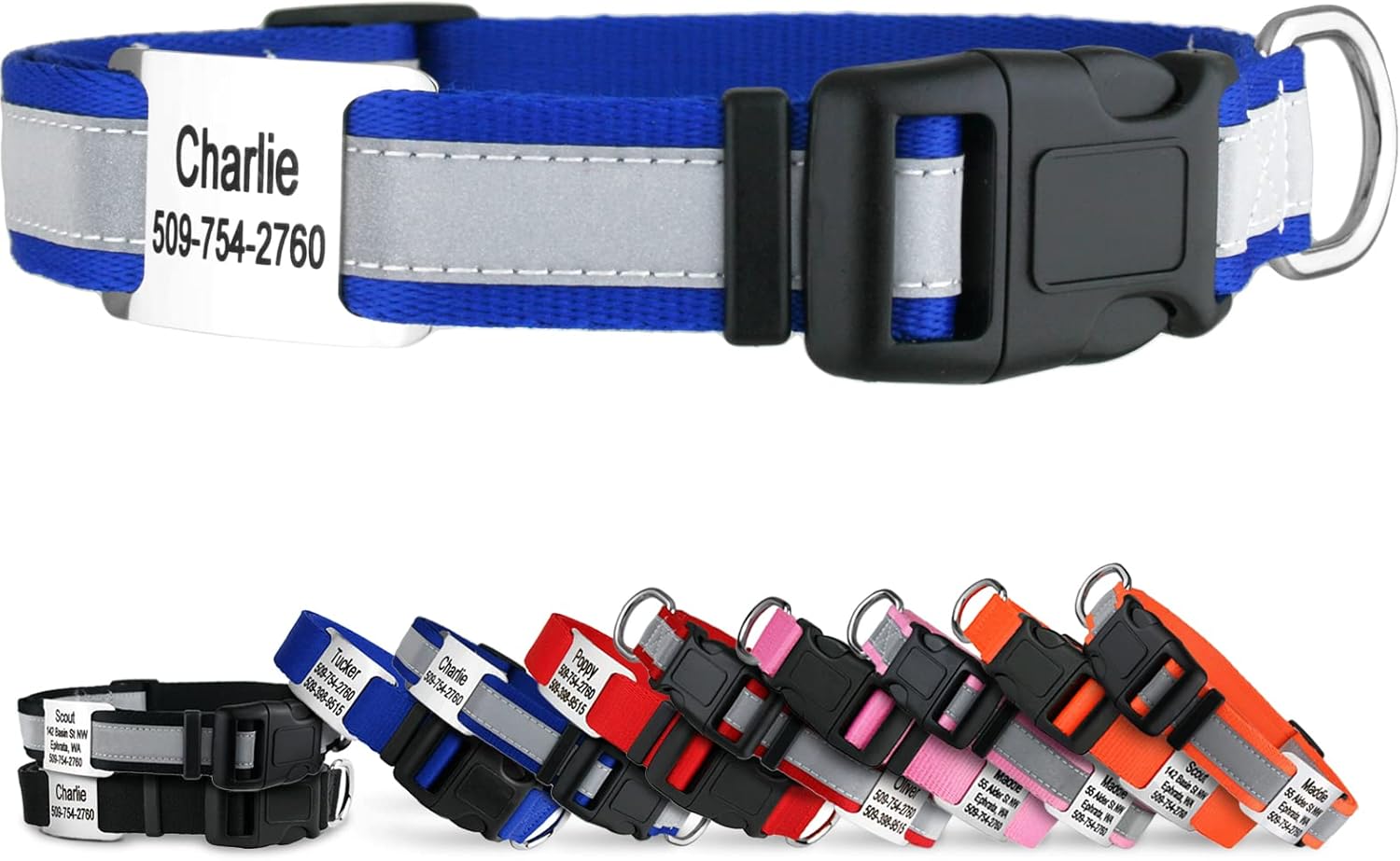 GoTags Reflective Personalized Dog Collar with Nameplate, Adjustable Dog Collar with Custom Engraved Steel Slide On Pet ID Tag, Silent, No Noise Dog Tag for Large Medium or Small (Blue, Small)