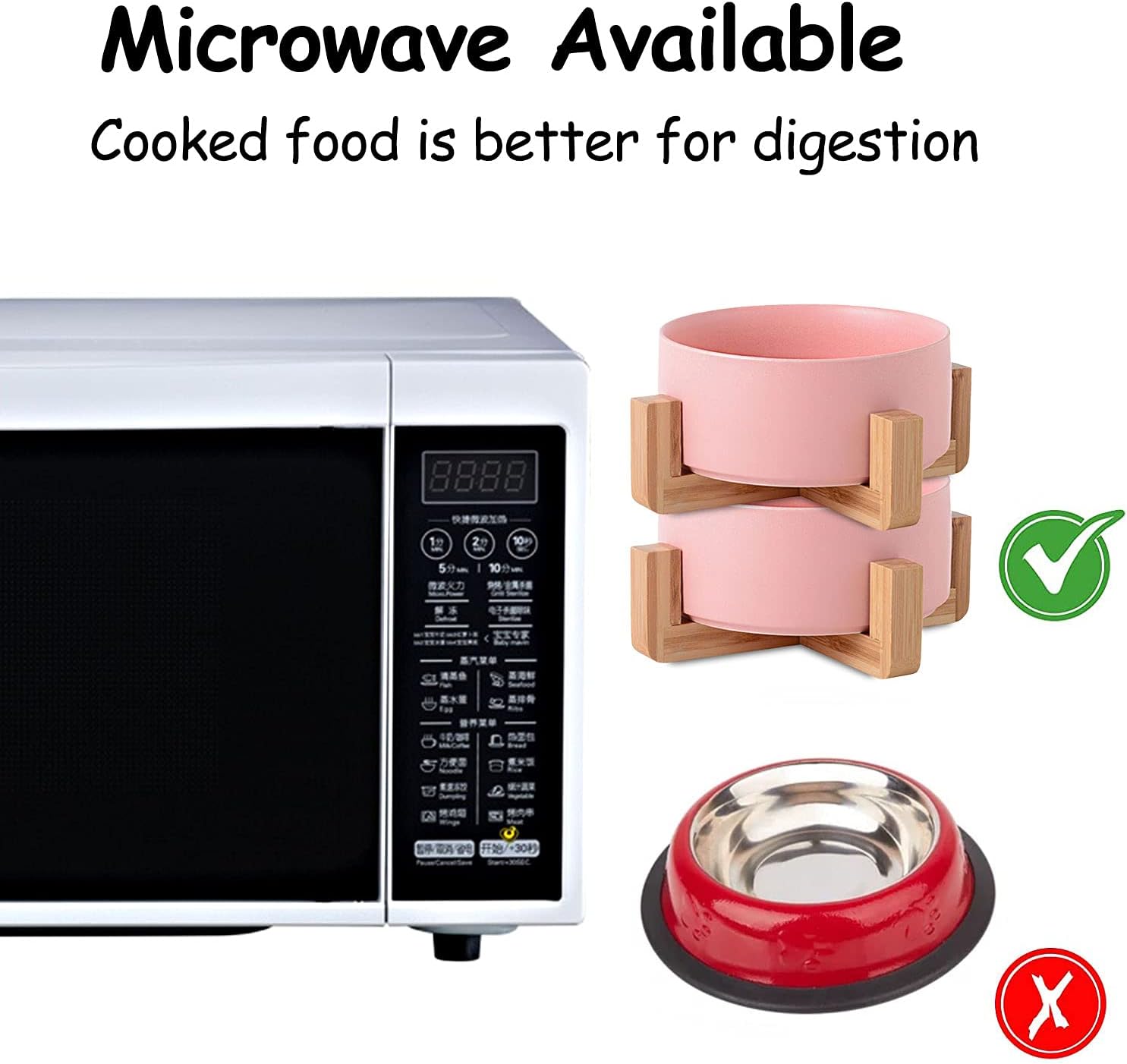 - MODERN CUTE NON-SLIP STAND : Modern Cute dog cat food water bowls with WOOD STAND that can keep the playful pet from moving the bowl easily. Effectively prevent food from spilling and keep the floor clean and tidy, More durable than fragile porcelain and heavier than flimsy plastic dishes, stoneware strikes a perfect balance between a durable, heavy material and an elegant appearance.