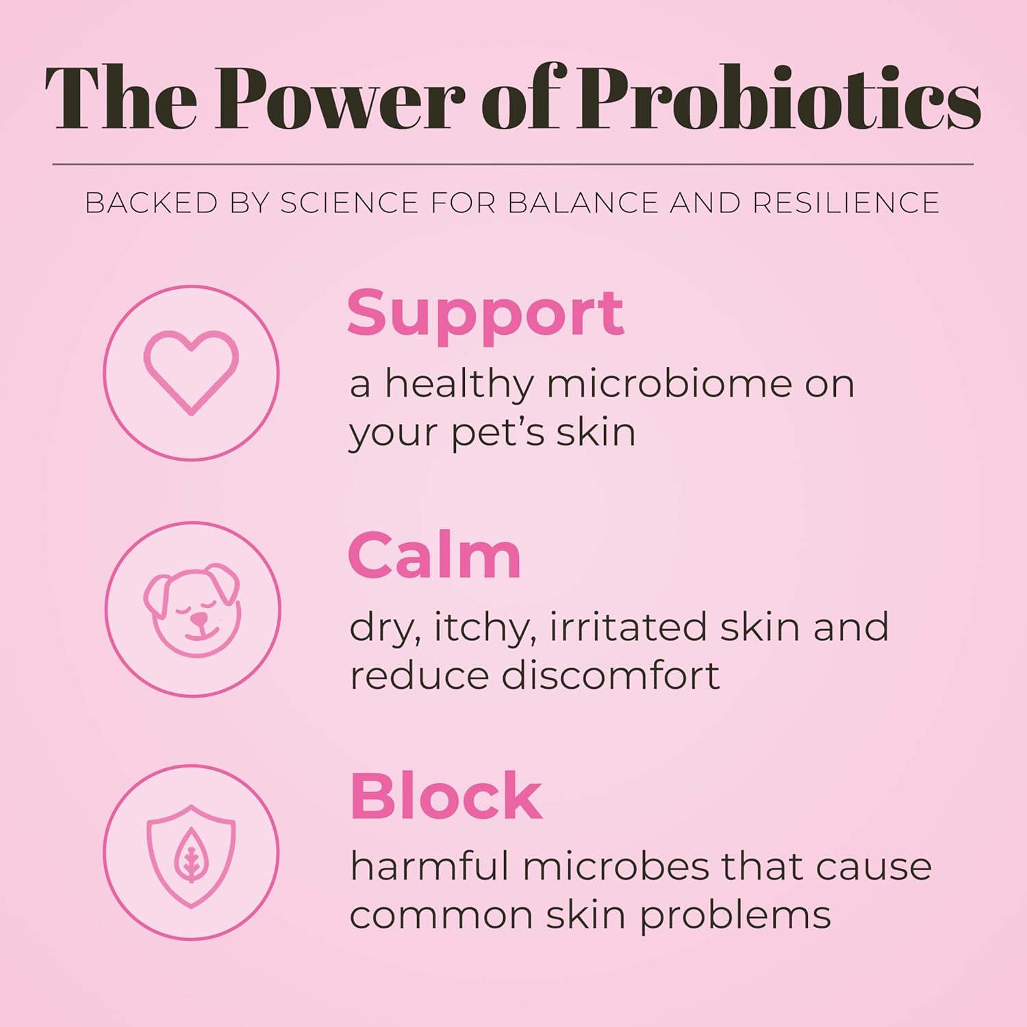 - Probiotic Formula- Each bottle contains topical probiotics that help support a healthy microbiome to defend against common skin problems such as itching, odor, dryness, dandruff, hot spots, and excessive shedding.
