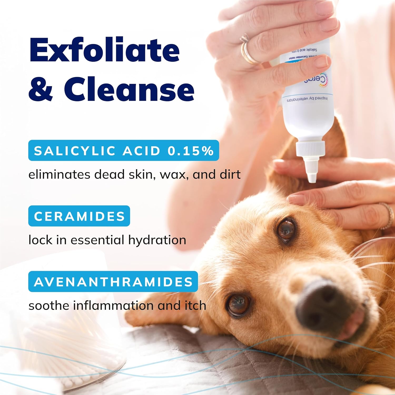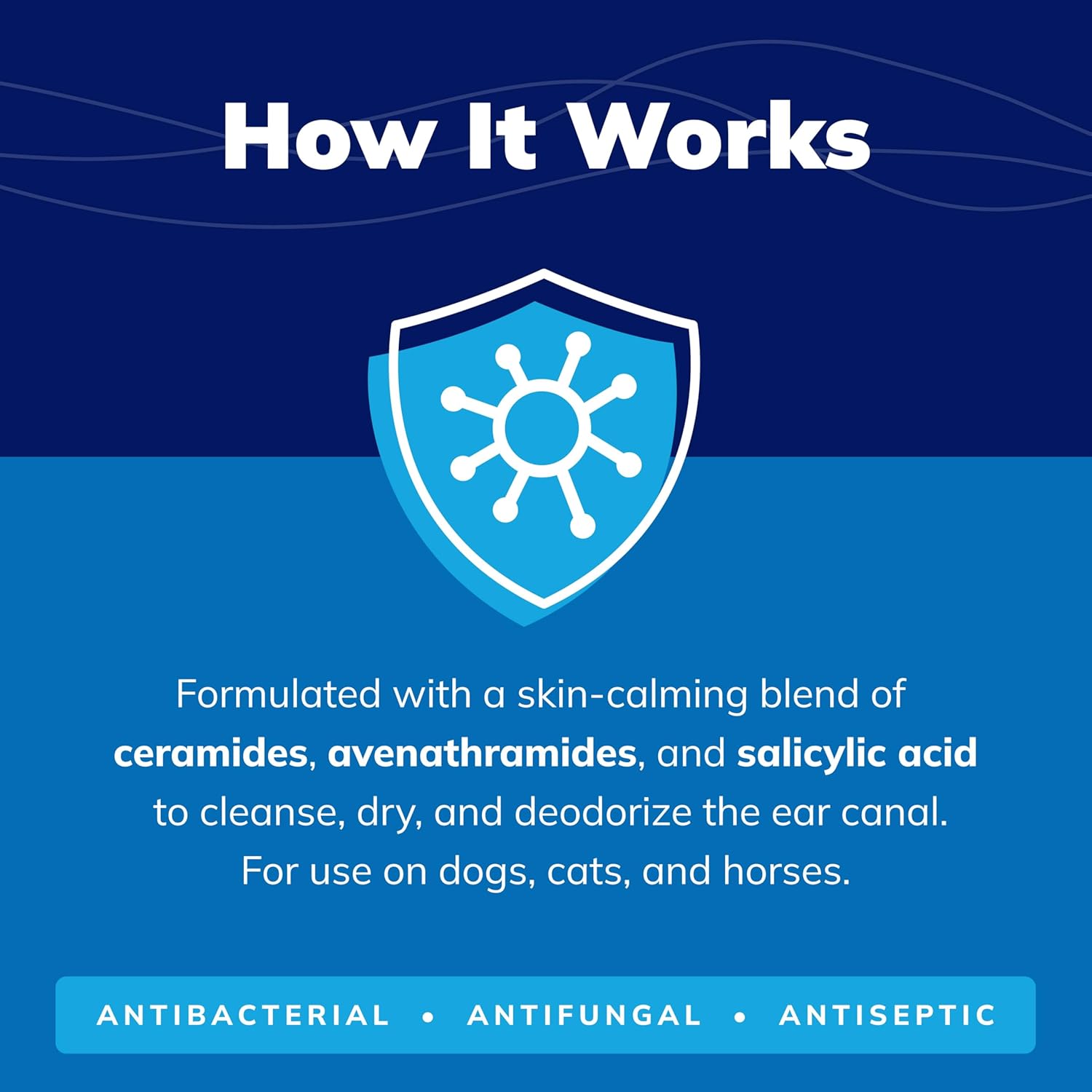 - Cleans, dries, and deodorizes the ear canal