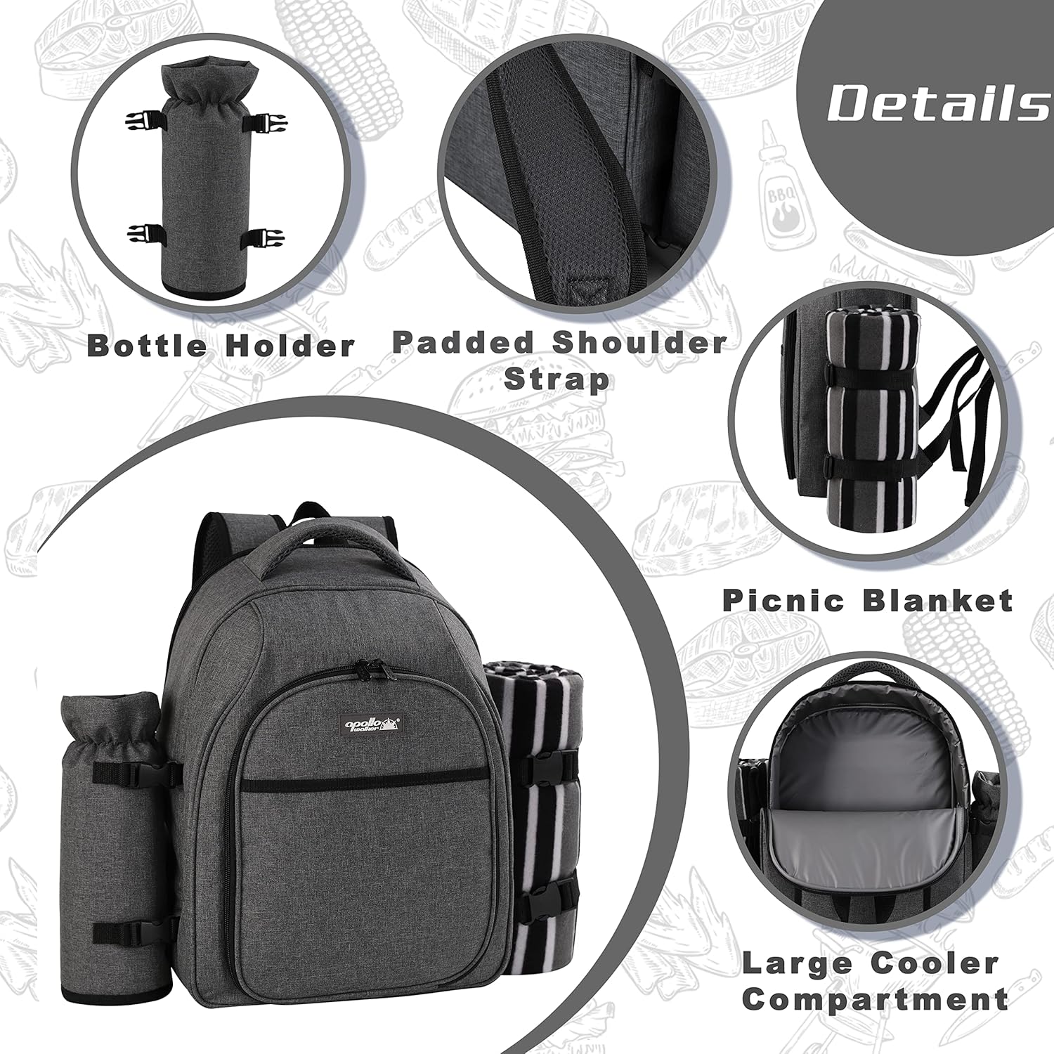 apollo walker Picnic Backpack Bag for 2 Person with Cooler Compartment, Detachable Bottle/Wine Holder, Fleece Blanket, Plates and Cutlery Set (2Person,Grey)