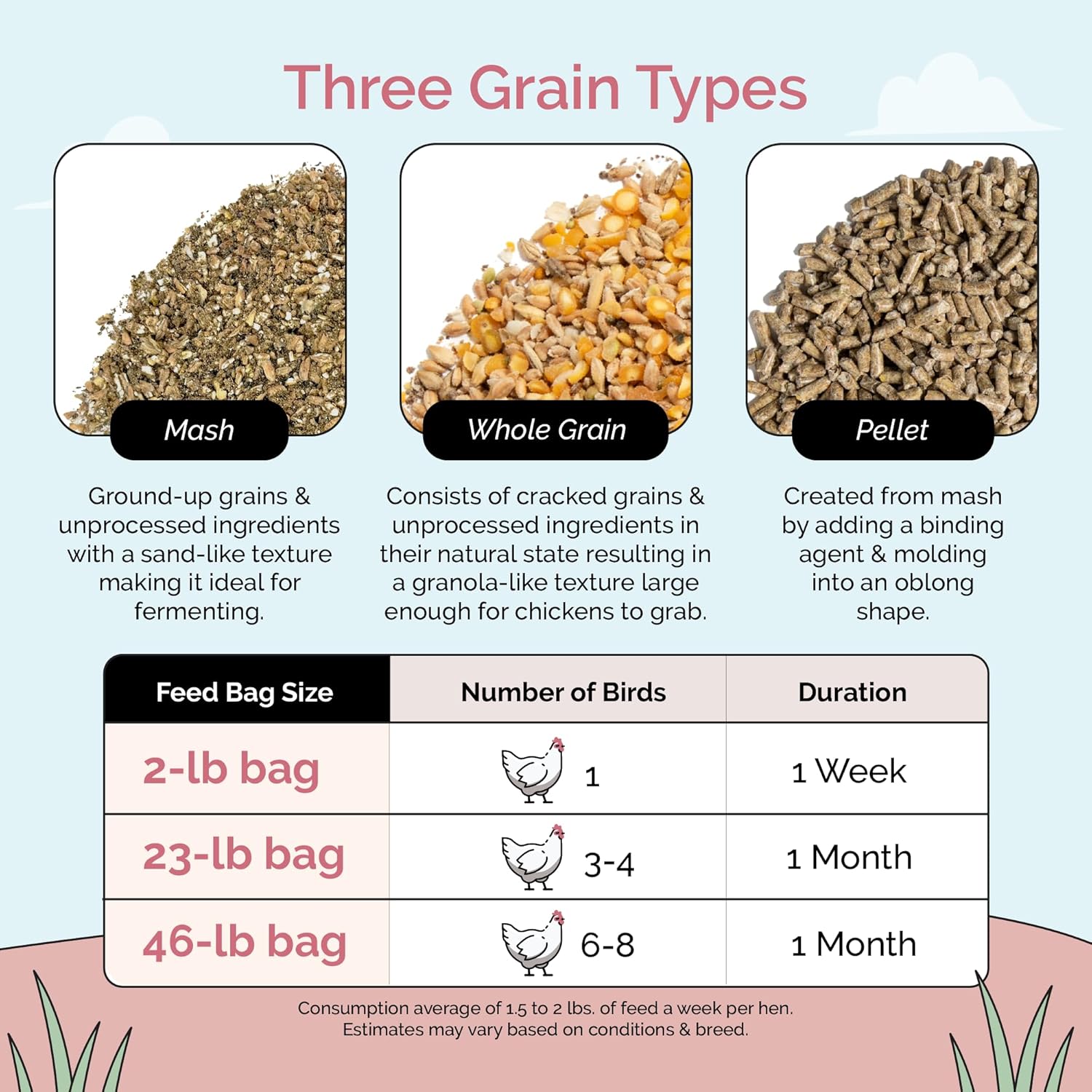 - 3 CHICKEN FEED TYPES: Chickens are picky eaters, choose from 3 feed types; Whole Grain (natural textures, ideal as chickens are visual eaters), Pellet (reduces waste & provides uniformity), Mash (best for chicks & fermenting; may lead to messy eating)