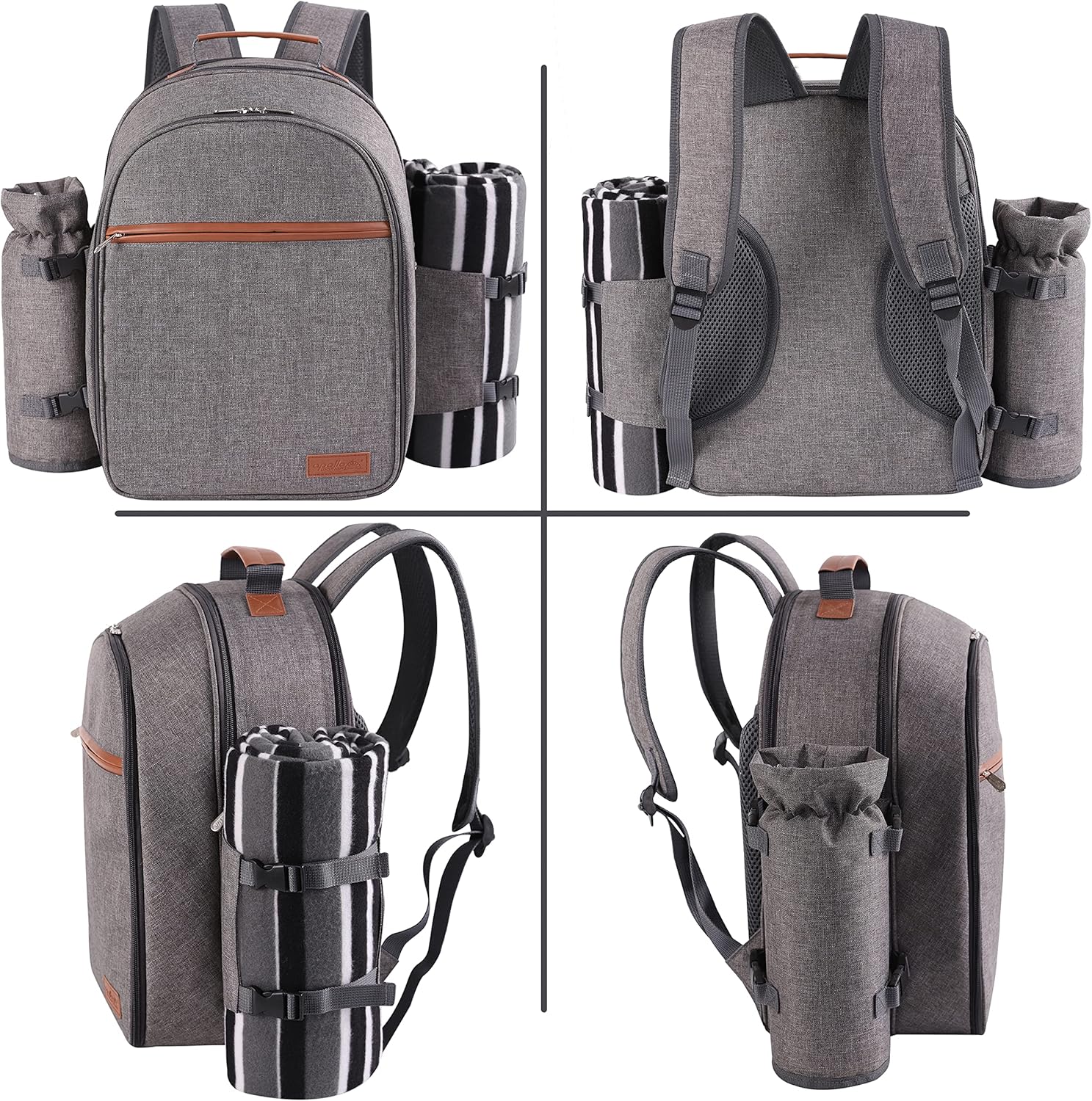 - Comes with a detachable insulated bottle/wine cooler carrying a large bottle of wine/water securely and a large fleece picnic blanket with waterproof backing which measures 45x53 inch.The blanket&wine cooler are stored in the the main cooler/cutlery compartment for easy transporting,please note to check it to find the blanket&wine cooler.