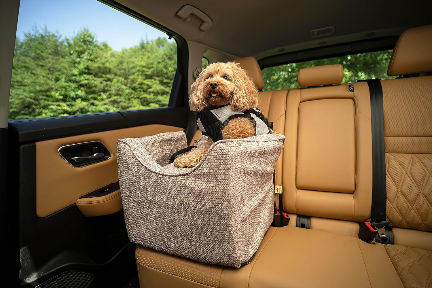 - Elevate your pup's car journey with the luxurious Lookout I dog booster car seat. The elevated dog car seat provides a raised seat for your dog to see out the window. Seeing out the window from a raised dog car seat can alleviate anxiety and ease car sickness for dogs who struggle with car rides. More than a seat, it's a cozy dog bed for car journeys that is crafted from plush, soft fabric and shock-absorbing foam to ensure a smooth, comfortable, enjoyable car ride for your furry family member.