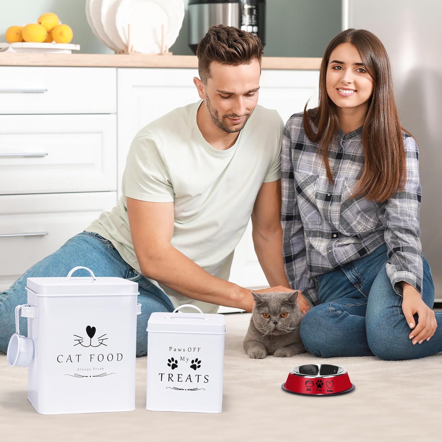 - πππͺππ¬π¦ ππ₯ππ¦π ππ’π’π! This white metal cat food container set is made of Powder Coated Metal Steel and is covered by tight-fitting lids creating the perfect storage environment. Long-lasting freshness for your cat's food!