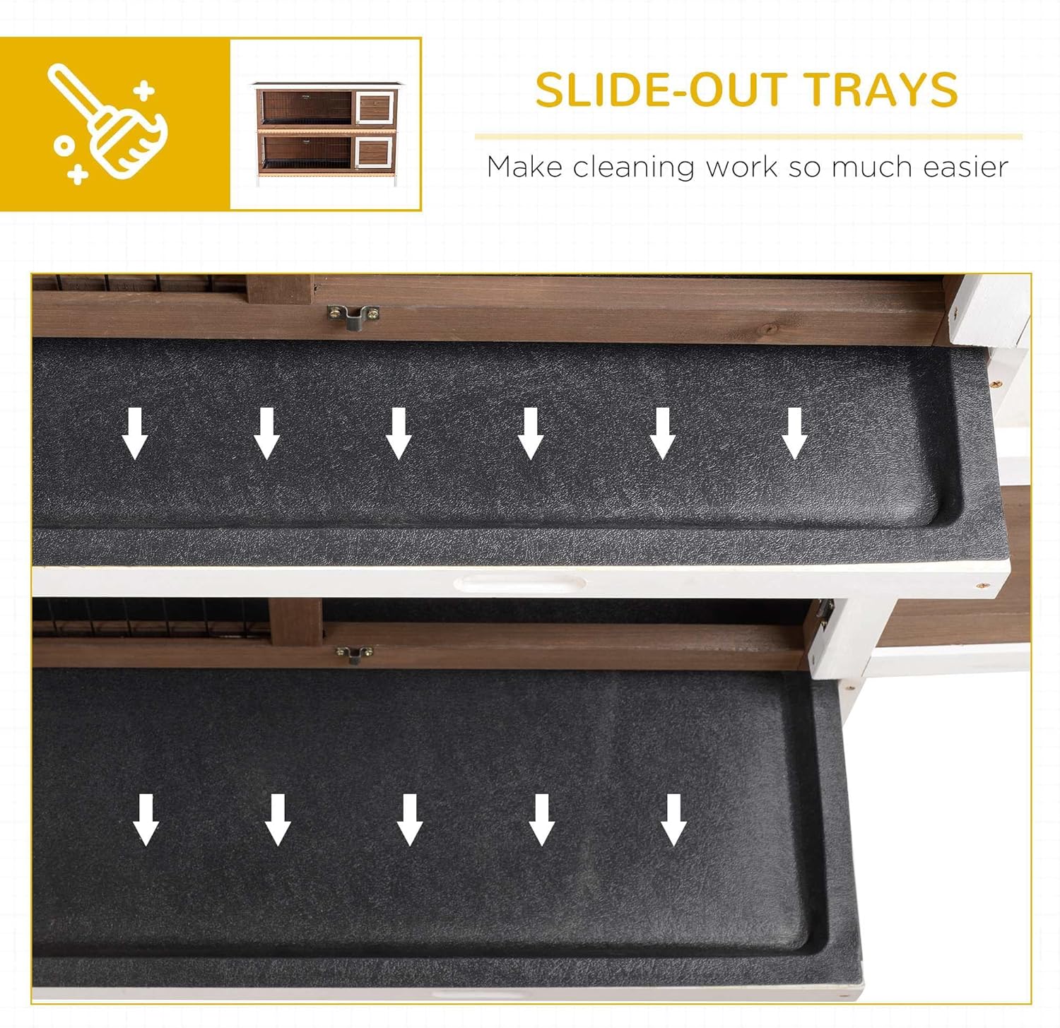 - Easy Access: This rabbit cage outdoor makes things simple for you. You can open the cage with multiple side doors that can close. Then, two pull-out trays for easy access to the inside space for cleaning, feeding, and more.
