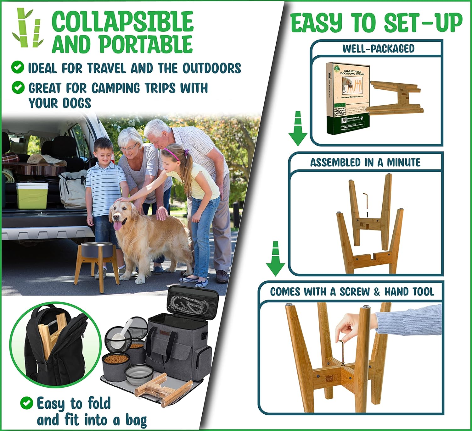Dog Bowl Stand (12-inch High) - Ideal for Large Breeds - Adjustable Sideways, Slanted Feet - Elevates, Raises Pet Food Feeders, Water Dishes, Fountains, Dispensers - Bamboo Stand Only