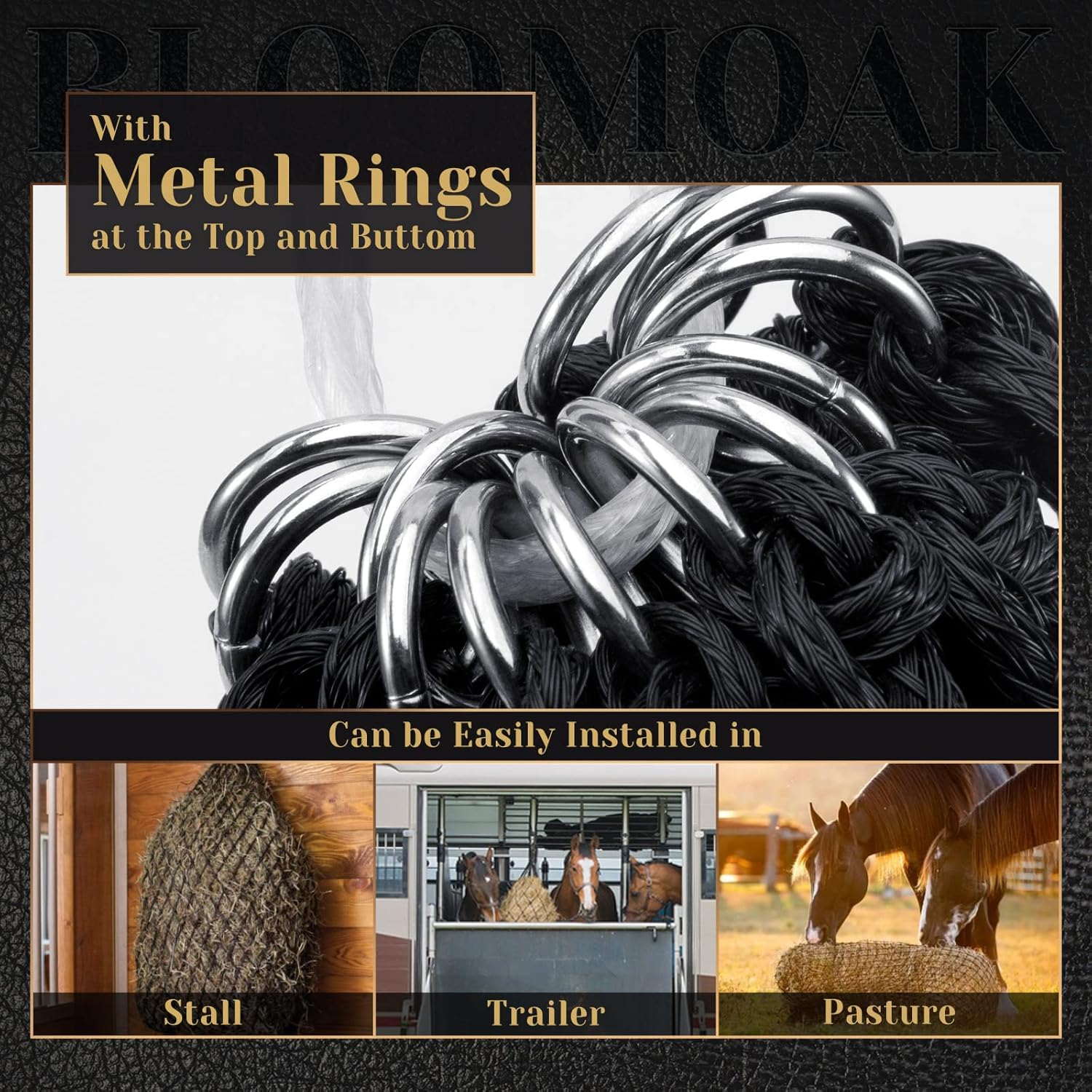 Bloomoak Slow Hay Net Feeder for Horses, Durable Soft Black PE 2/3 String Hay Bales Bags, Fit 36x18x18 to 47x25x17 Inches, Extends 50-64 Inches (2 1.6" Hole/2PC)