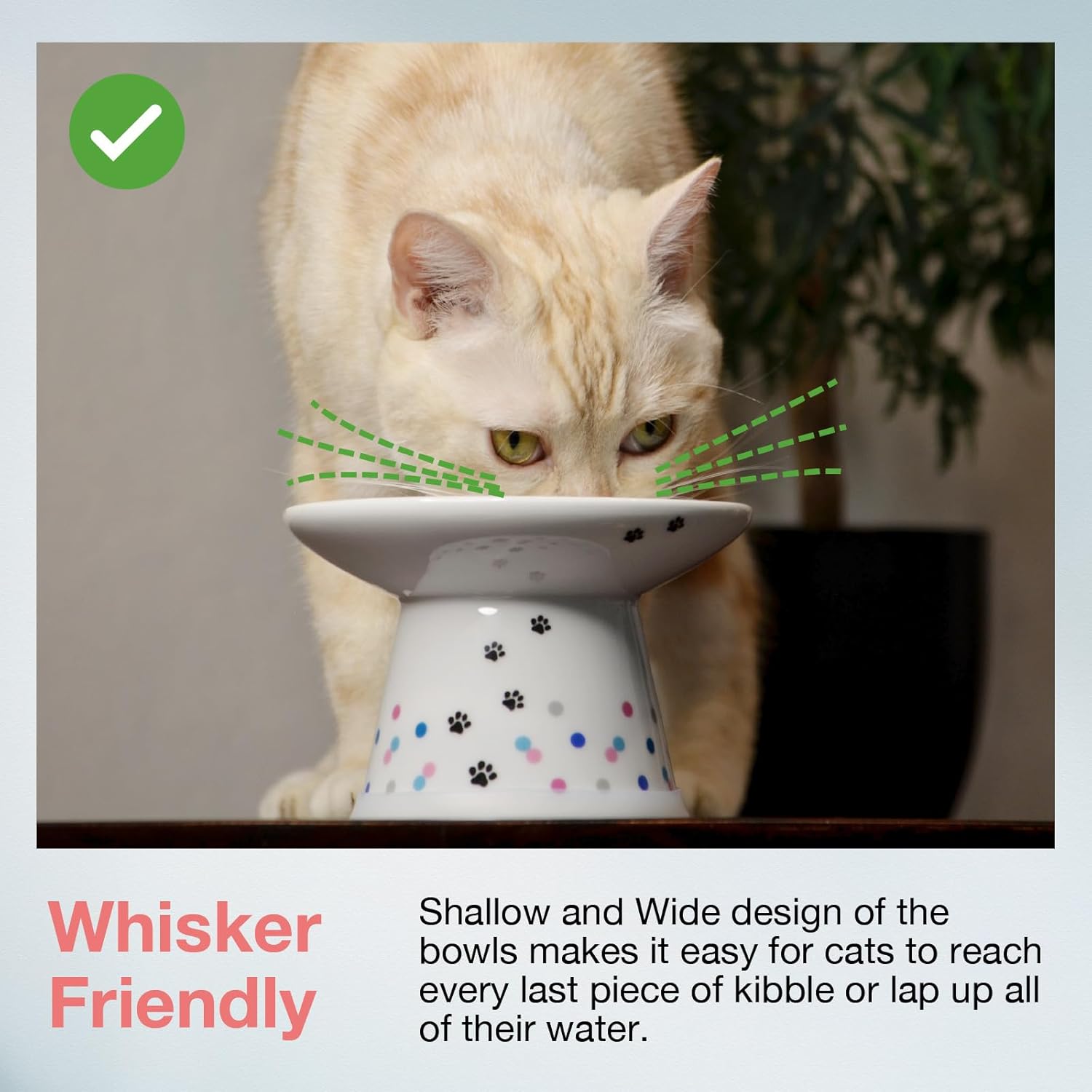 - Design & Comfort: This extra wide elevated cat food bowl (colorful dots limited edition) helps reduce whisker fatigue and strain on your cat’s neck; ideal for flat-faced breeds and messy eaters, serving as whisker fatigue cat bowl which keeps food centered.