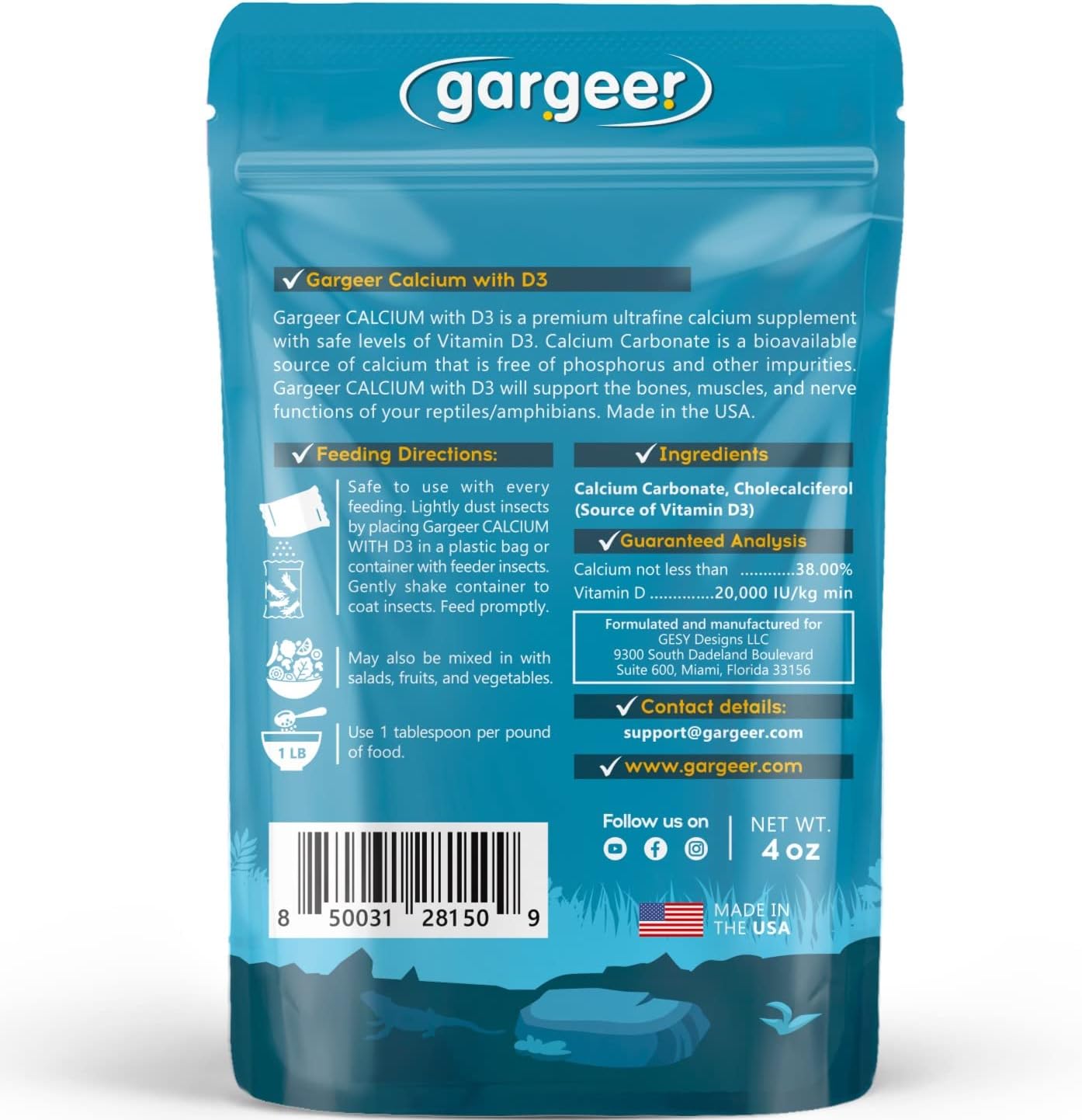 - US BORN AND RAISED. Free from phosphorus and other impurities, Gargeer’s formula is proudly made in the USA from locally sourced calcium. If you and your reptiles are happy, we are happy! Ping us with any calcium questions you have, and we’ll do our best to respond promptly. Enjoy!