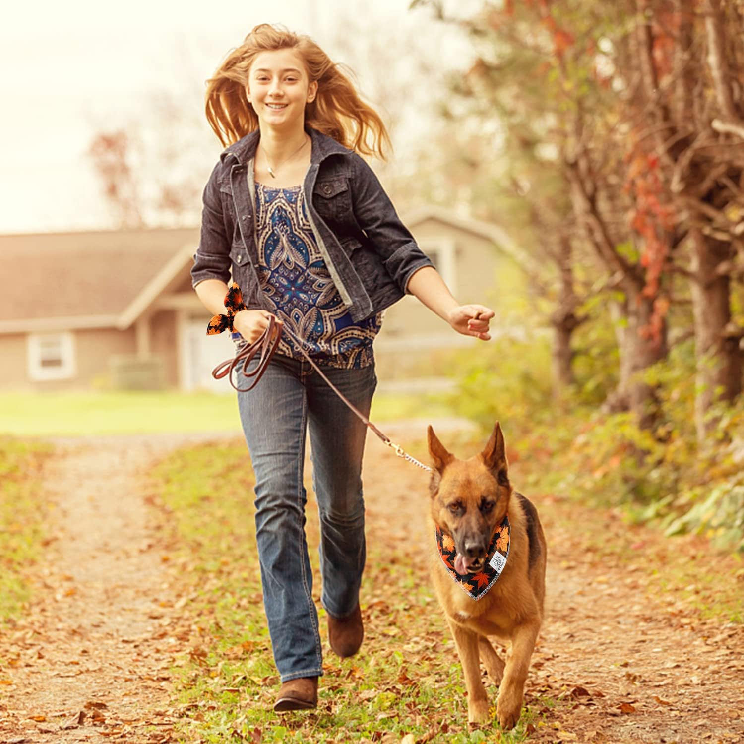- Matching Dog and Owner- It’s so cool and lovely, dog mom and dogs are wearing the matching costume together. When traveling, daily walking, or taking photos, adorable dog bandanas boy with scrunchie is both fashion and personalized dog matching owner accessories. The bow scrunchies can be worn as a wrist accessory, or as a ponytail holder hair band . Beautiful dog and human matching clothes set with orange red brown fall leaf print, it’s nice fall themed photo props.