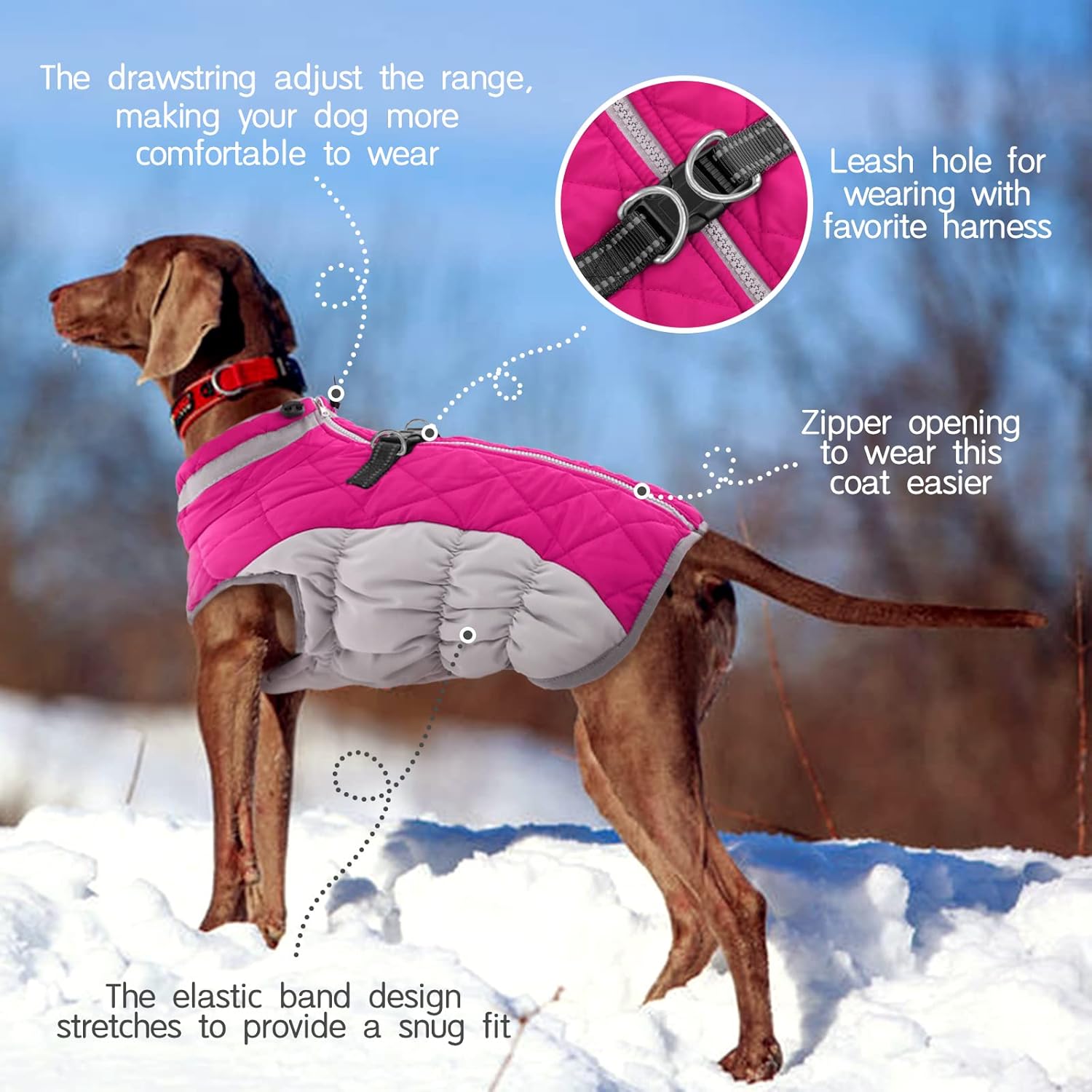 - Harness & Zipper On The Back:Say goodbye to the struggle of dressing your dog! FUAMEY dog snow jacket with zipper on the back and harness built in.The zips have been upgraded and are now very durable.Back harness allows for easy access on the go,allowing you to clip the leash directly to the jacket—no need for a separate harness or collar