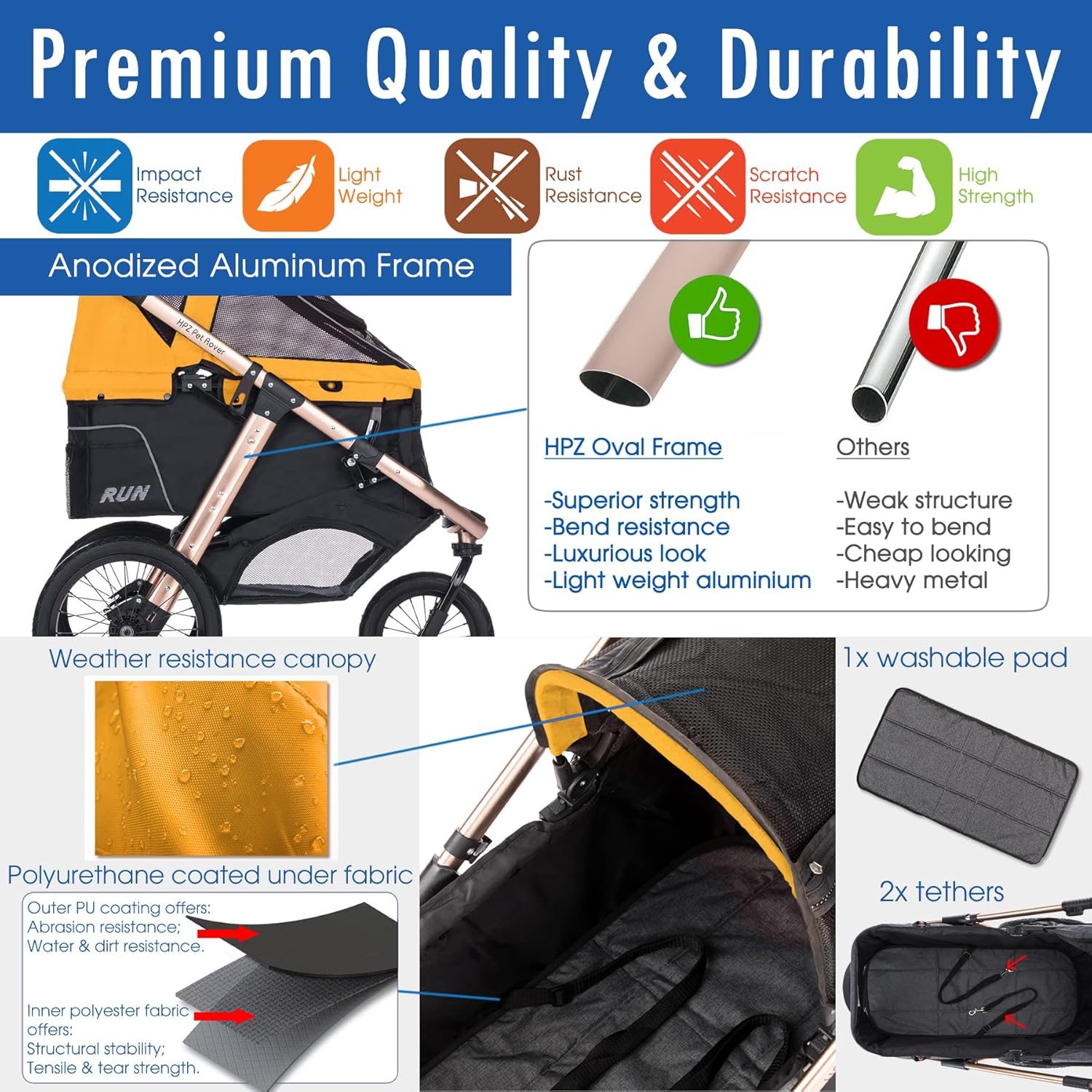 - LIGHTWEIGHT & DURABLE ★ Rigid yet light-weight frame offers strong construction using anodized aluminum alloys in luxurious gold color, this rust-free metal makes for an extremely durable product. It also includes machine-washable carrier pads and durable water-resistant fabric