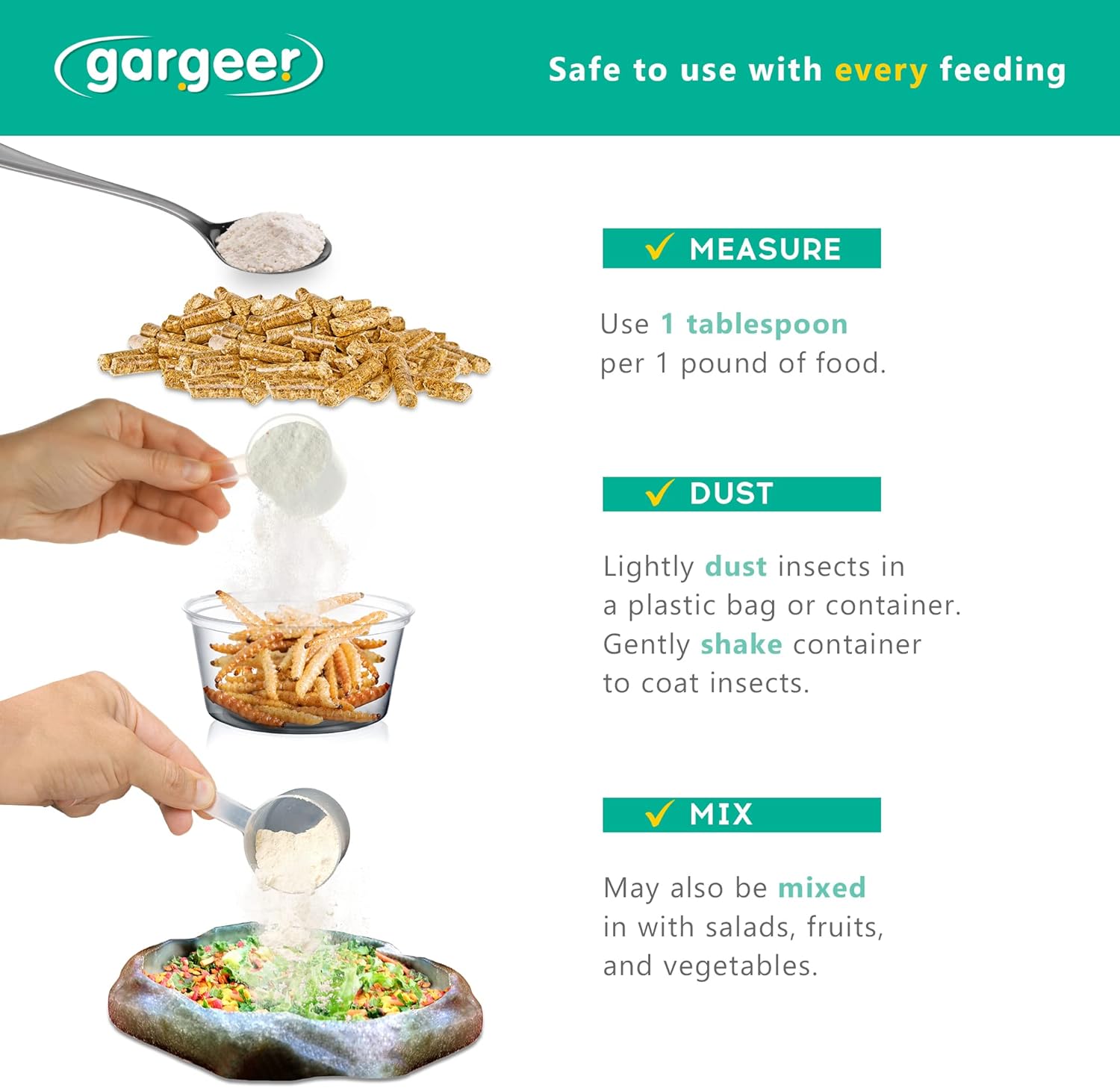 - SAFE. Most live feeder insects for reptiles are naturally low in calcium and require dusting with calcium powder to be nutritionally adequate. Gargeer formula is safe to use with every feeding, without the risk of hypercalcemia.