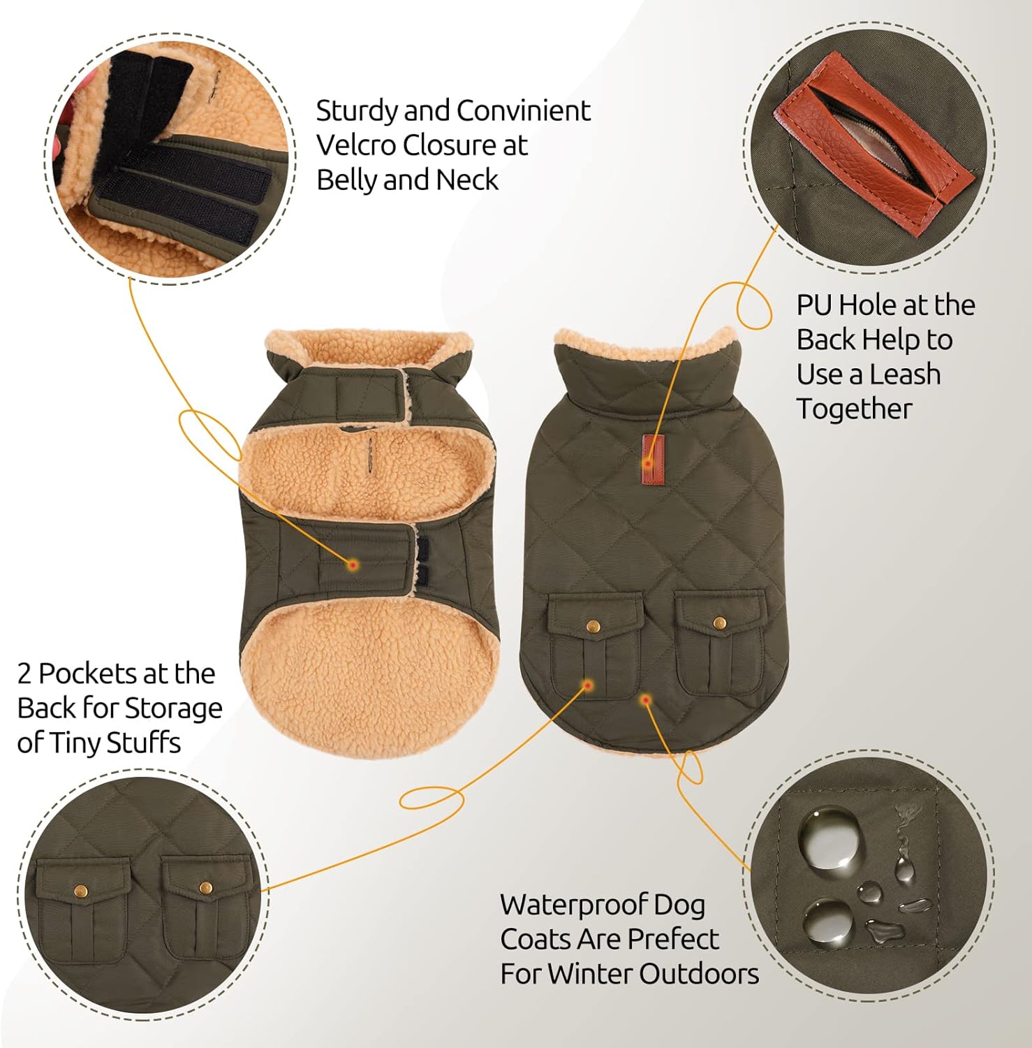 Queenmore Warm Dog Coat, Cold Weather Puffer Dog Coat, Quilting Winter Dog Jacket Ultra Thick Plush Lining with Storage Pockets (Green, Small)