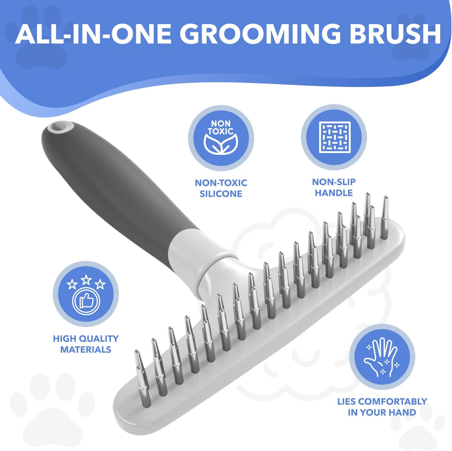 - One of the best dog brushes on the market, It has a double row of stainless steel pins/teeth to reduce pulling the coat without damaging it or hurting your pet. It is a very gentle experience for your dog, cat, rabbit, or any other furry friend that needs brushing.