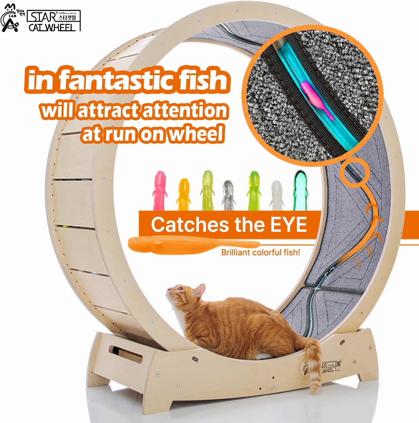 Star Cat Wheel, Cat Treadmill, Exercise Wheel for Running, Spinning, Scratching, and Climbing for Indoor Cats, Premium Birch Wood, Eco-Friendly, Moving Fish, Wide Running Track, 41.7 inch L Size