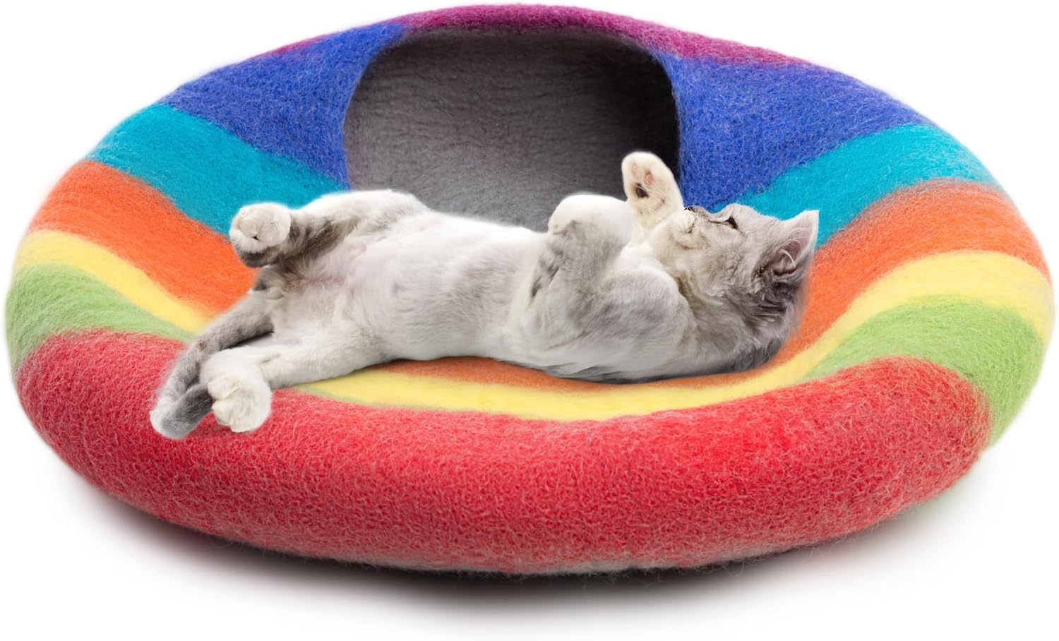 Woolygon Premium Felt Cat Cave Bed β Wool Kitty Beds Handcrafted Kitten Caves Bed for Indoor Cats - Made from 100% Eco-Friendly Merino Wool, Foldable Cat Hidewawy Covered Cat House Pod (Rainbow Twist)
