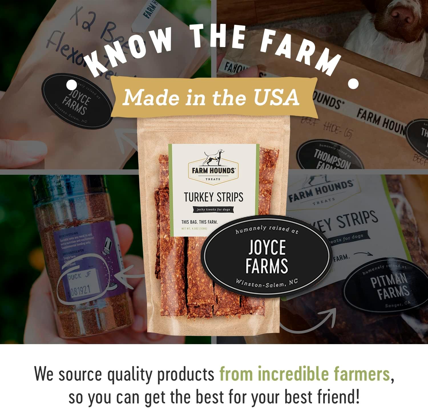 - FARM HOUNDS - At Farm Hounds, we believe healthier animals are happier animals. With your canine in mind, we make all of our treats nutritionally beneficial and delicious. Our close relationship with all-American family farmers who raise their animals in a humane way, helps us use premium raw materials for our products.
