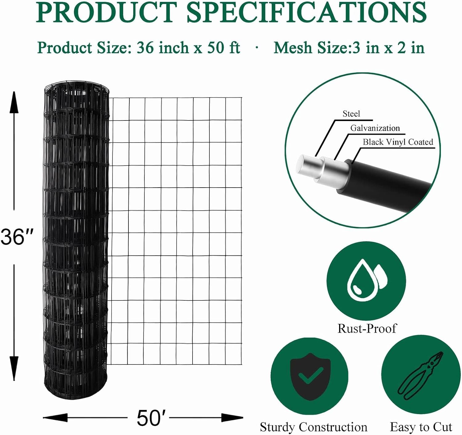 Black PVC Coated Welded Wire Fence 36 Inch x 50 Foot, 2 Inch x 3 Inch 16GA, Garden Border Fencing Roll Vinyl Coating Metal Wire Mesh for Yard Vegetable Plant Protection Poultry Netting
