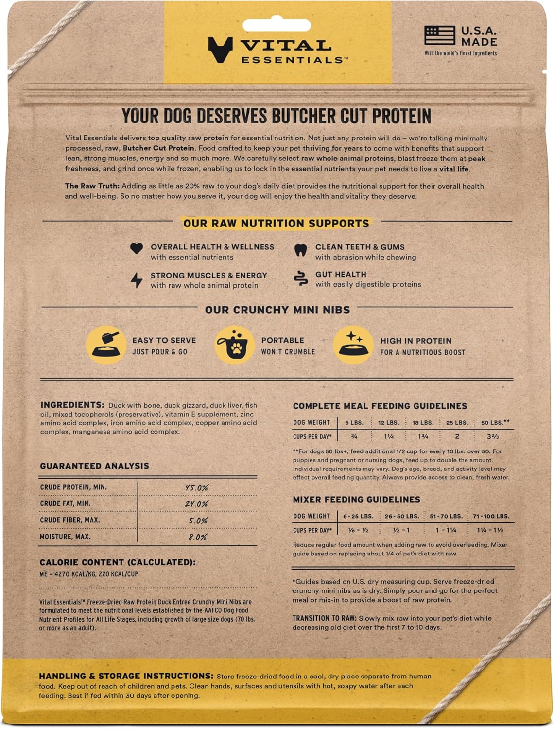 - CRUNCHY FREEZE-DRIED RAW DUCK DOG FOOD: Vital Essentials Crunchy Freeze Dried Dog Food packs more protein than industry standard into every bite to deliver the peak vitality your dog deserves, especially when compared to dehydrated dog food. This complete and balanced freeze-dried raw dog food is made with premium butcher cut duck, responsibly sourced in the EU.