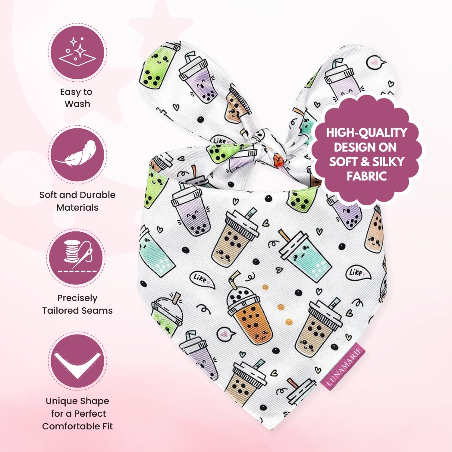 LunaMarie - Luxury Pet Birthday Bandanas -Premium & Silky Poly Fabric | 100% Handmade | Custom Shape Dual Layered (Boba, Large)