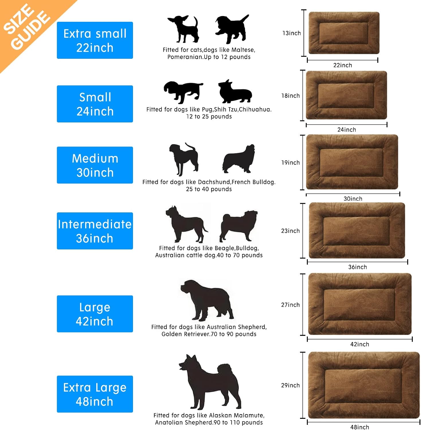 - SIZE GUIDE: Ideal dog bed for wire dog crates.This pad measures approximately 36inch*23inch.Fit for dogs weighing 40 to 70 pounds such as Beagle,Bulldog,Australian cattle dog.