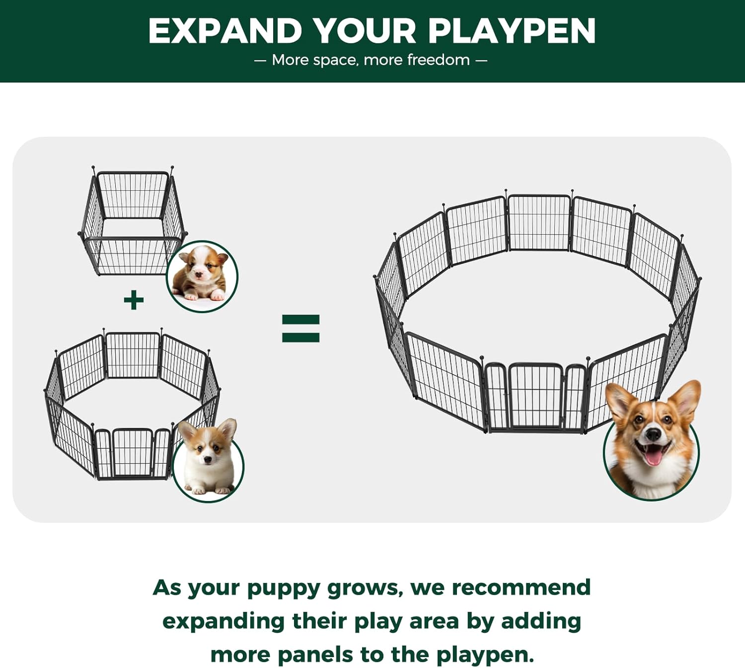 - Super easy to assemble: It won’t take you more than 5 minutes to assemble these portable dog fences as well as pack them away due to the rod-connected design. Meanwhile, panels can be added or removed freely to give you a fully flexible area and arrange the dog pen in any shape you need.
