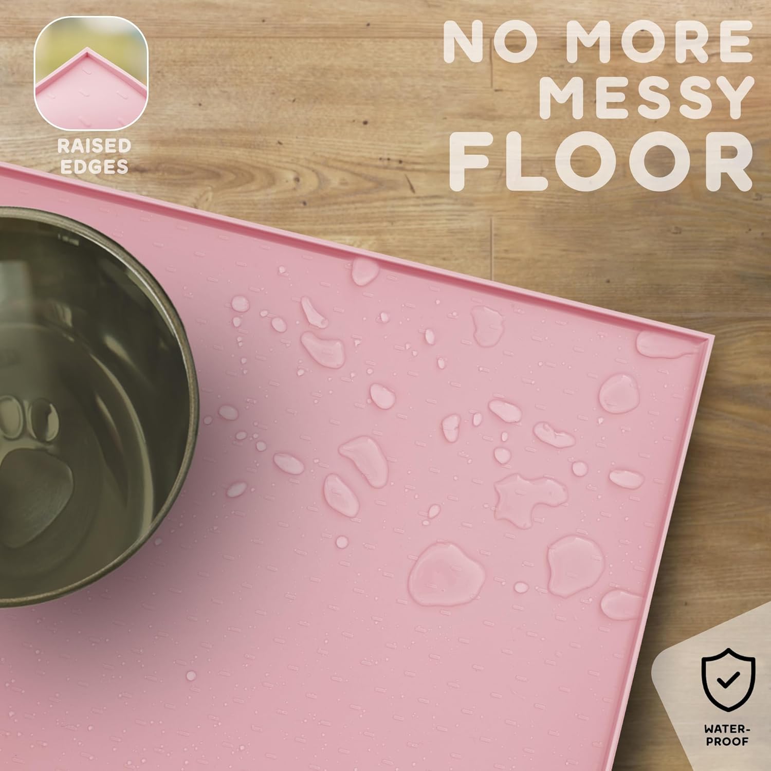 - RAISED EDGES KEEP THE MESSES WHERE IT BELONGS: Keep Your Home Spotless & Enjoy Hassle-Free Dinnertime with Your Furry Friend! Whether they eat with enthusiasm or like to play with their food, our 18.5"x11.5" dog food mats for floors waterproof are specially designed to reduce cleanup time for both wet and dry foods. Treat yourself and your furry pal to a cleaner, more enjoyable mealtime experience.