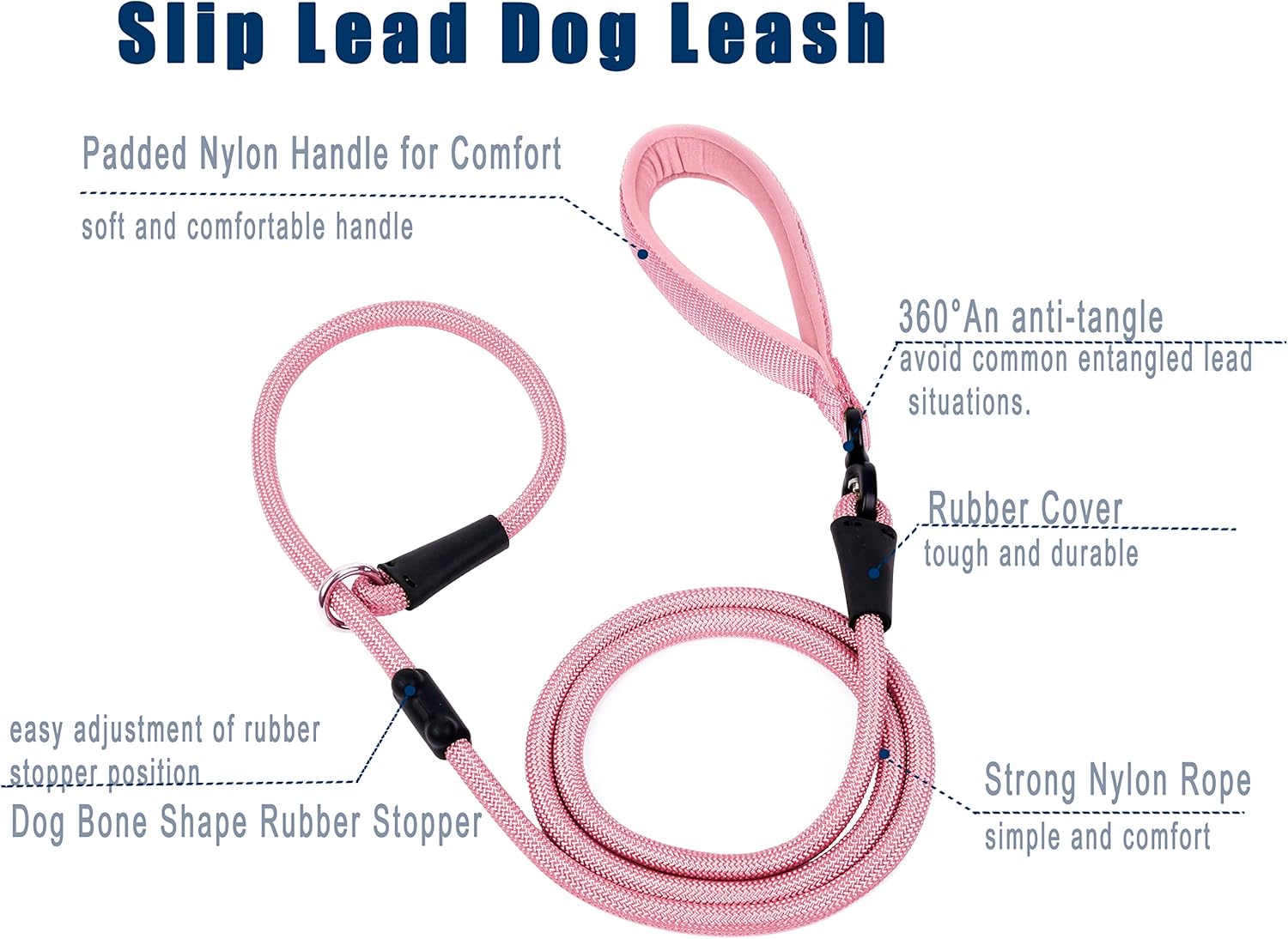 Slip Lead Dog Leash,Strong Nylon Rope Leash and Padded Handle,No Pull Outdoor Walking Training Lead for Small Medium Large Dogs(Pink, 1/2"×6ft)