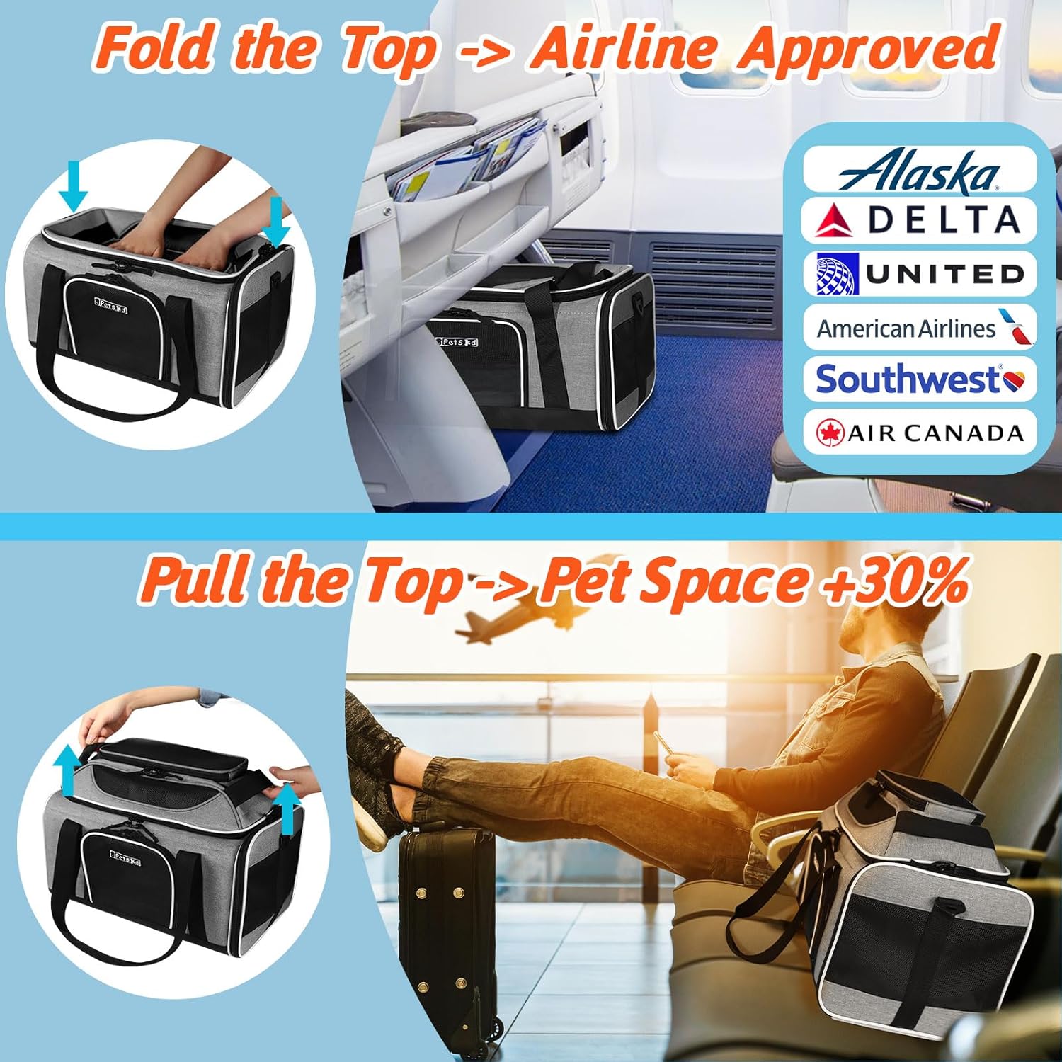 - 【AIRLINE APPROVED CARRIER 】Unfolded size:17"L×11"W×(9.5+3.5)"H, Petskd pet carrier is TSA approved and can be placed under the seat in the cabin, it is mainly designed for ①Alaska Airlines:17x11x9.5", but also in compliance with ②Southwest Airlines:18.5x13.5x9.5" ③Delta Airlines:18x11x11" ④United Airlines:18x11x11" ⑤American airlines:18x11x11" ⑥Air Canada:21.5x15.5x10.5". We recommend you buy this carrier when you fly with the above-mentioned airlines.