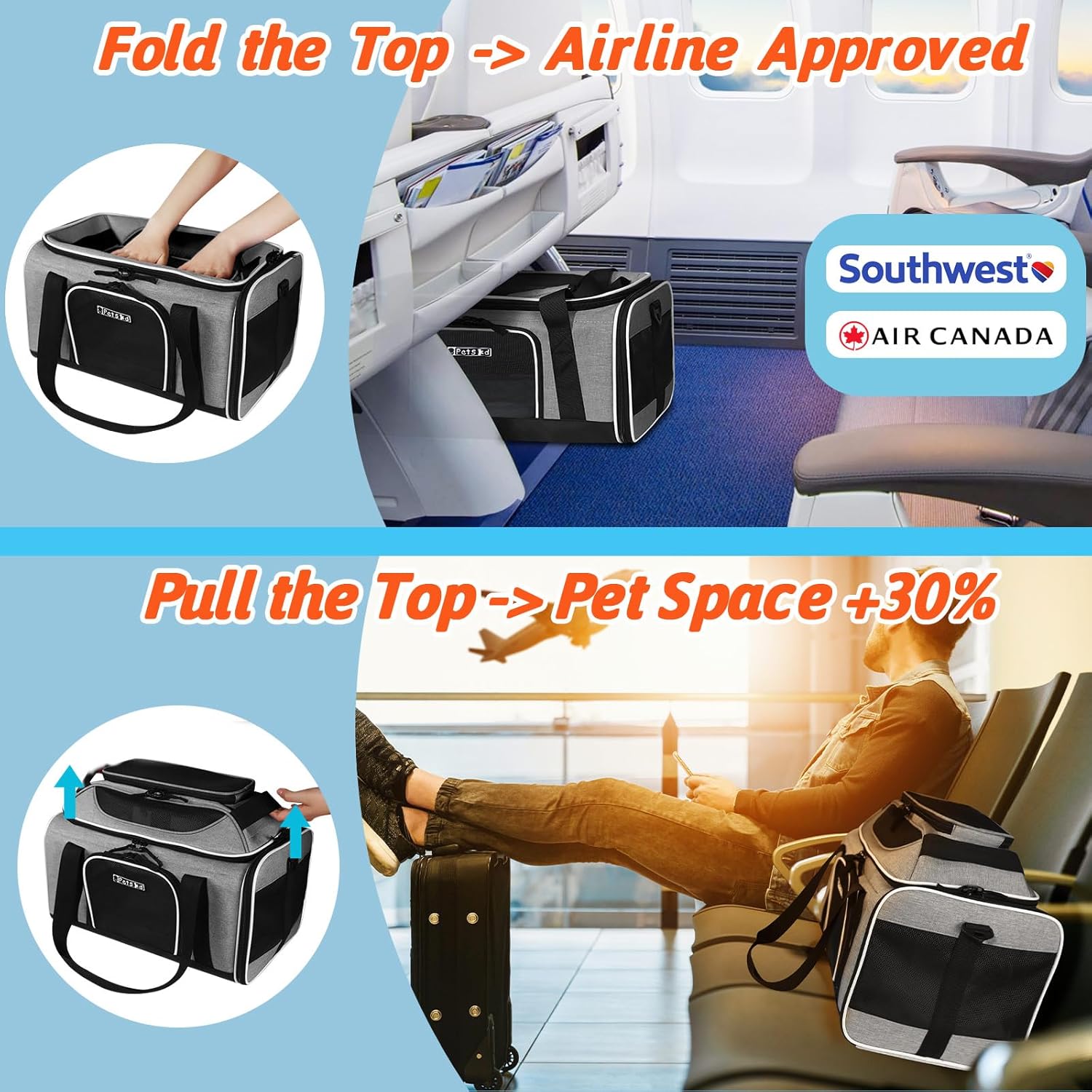 Petskd Top-Expandable Pet Carrier 18x13x9.5 Inches Southwest Airline Approved, Soft-Sided Carrier for Small Cats and Dogs with Locking Safety Zippers and Anti-Scratch Mesh(Grey)