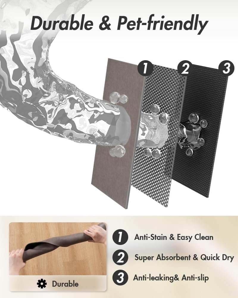 - Super Absorbent & No Stains: Special absorbent surface hide any messy stains completely. Magic pet food mat catch every drip off pets' chin around the pet water or food bowl. Prevent Say goodbye to spread stains and messy feeding area.