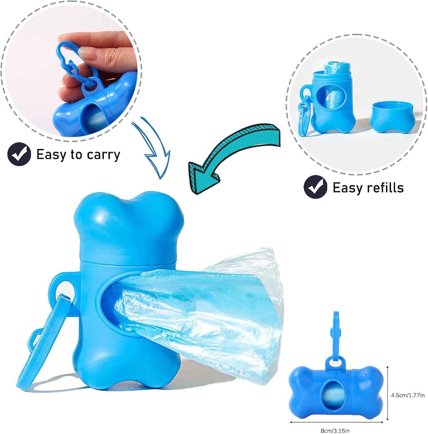 - [Dog Poop Bag Dispenser]: Inlude 15 Sturdy Bags Per Roll. The dog bag dispenser with plastic clip, it can good to attach to your bag. Easy to carry poop bags.